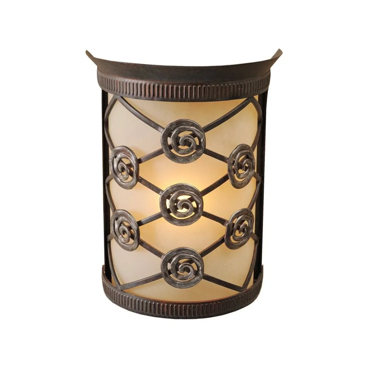 Компактный абажур горчичного цвета заботливо укрывает свет, струящийся от металлической свечи. Кованое основание сделано вручную и украшено по кайме затейливым орнаментом и металлическими декоративными элементами, напоминающими розы.