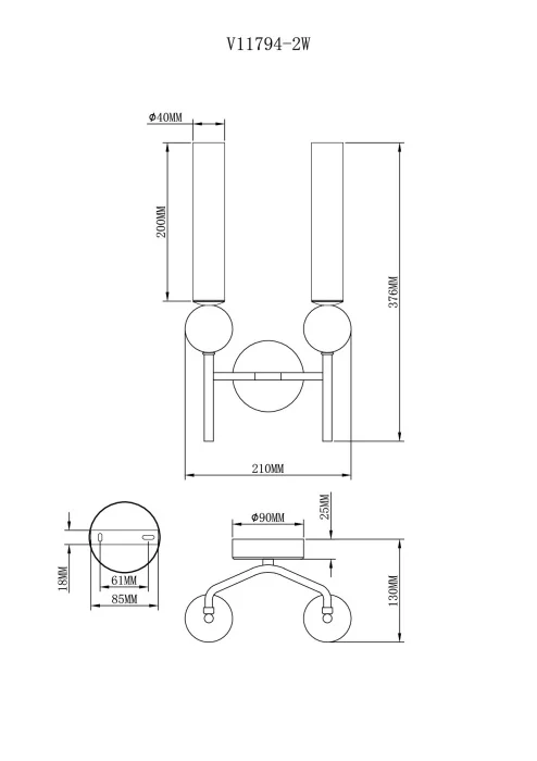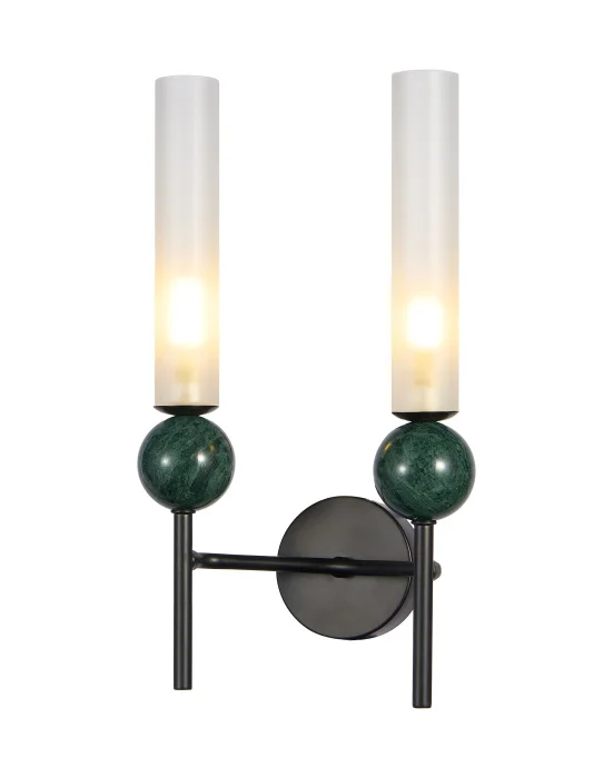 Светильник настенный Moderli V11794-2W Illis — акцент с мраморной изысканностью. Настенный светильник из коллекции Illis — это изящное сочетание строгой геометрии и утончённого декора. Удлинённый стеклянный плафон цилиндрической формы и выразительный шар делают модель эффектной деталью интерьера. Такая композиция объединяет эстетику современности и классику благородных материалов. Плафоны выполнены из белого дымчатого стекла, которые дают мягкий и рассеянный свет. Арматура изготовлена из прочного металла в чёрном цвете с матовой поверхностью. Главный декоративный акцент — гладкий сферический элемент из мрамора глубокого зелёного оттенка. Светильник рассчитан на две лампы с цоколем G9 и мощностью 5 Вт каждый, что в сумме даёт общую мощность до 10 Вт. Этого достаточно для создания мягкого акцентного освещения на площади до 4 кв.м. Свет направлен вверх, визуально расширяя пространство и придавая комнате ощущение уюта. Монтируется на стену с помощью планки, выключатель также расположен на стене. Подходит для сухих помещений (уровень защиты IP20). В комплект входят все необходимые элементы: монтажная схема, паспорт, упаковка. Moderli Illis станет прекрасным решением для дополнительного освещения в спальне, гостиной, холле, прихожей или кафе. Также подойдёт для гостиниц, загородных домов или стильных коммерческих пространств, добавляя им уюта и изысканности.
