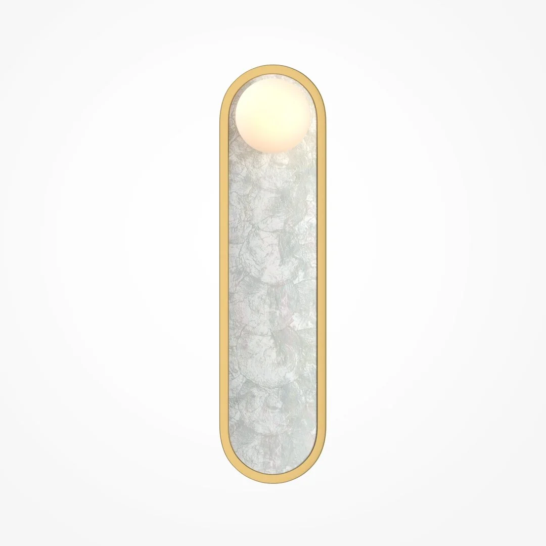 В серии представлены настенные светильники двух размеров и двух поколений. Декоративная мозаика из натурального перламутра играет нежнейшими бликами. Контраст текстур — переливы перламутра и матовая поверхность металла цвета латуни. LED-лента под акриловым рассеивателем создаёт ореол на стене. Предусмотрено трехступенчатое переключение температуры света через вкл-выкл (2700-3000-4000K), позволяющее создавать желаемую атмосферу. Эффектно светильники смотрятся и в комбинации друг с другом.