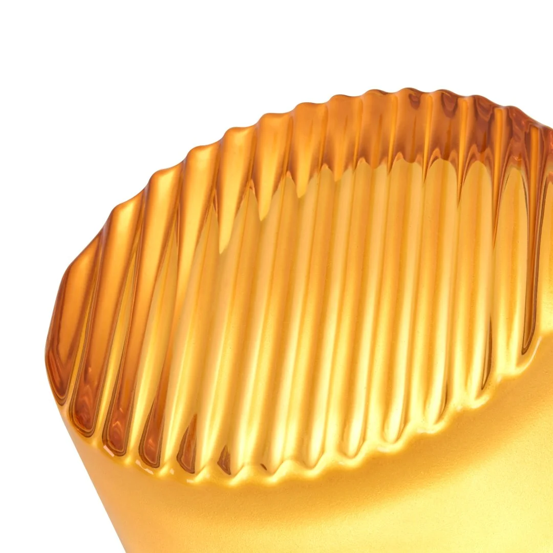 Металлическая арматура в цвете никель в трех рельефных основаниях. Плафоны, выполненные в приглушенно пшеничном и янтарном оттенках, доступны в двух размерах. LED источник света 2400К/2550К/3000K.