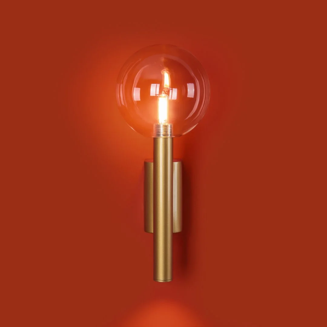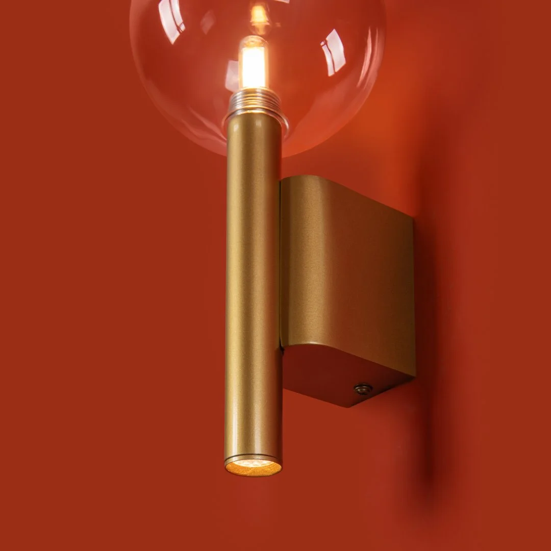Арматура - металл в цвете матовое золото. Светильники с прозрачным дутым стеклом. LED источник света (2700K). Круглые стеклянные абажуры создают тёплый свет. У настенного светильника 2 источника света.