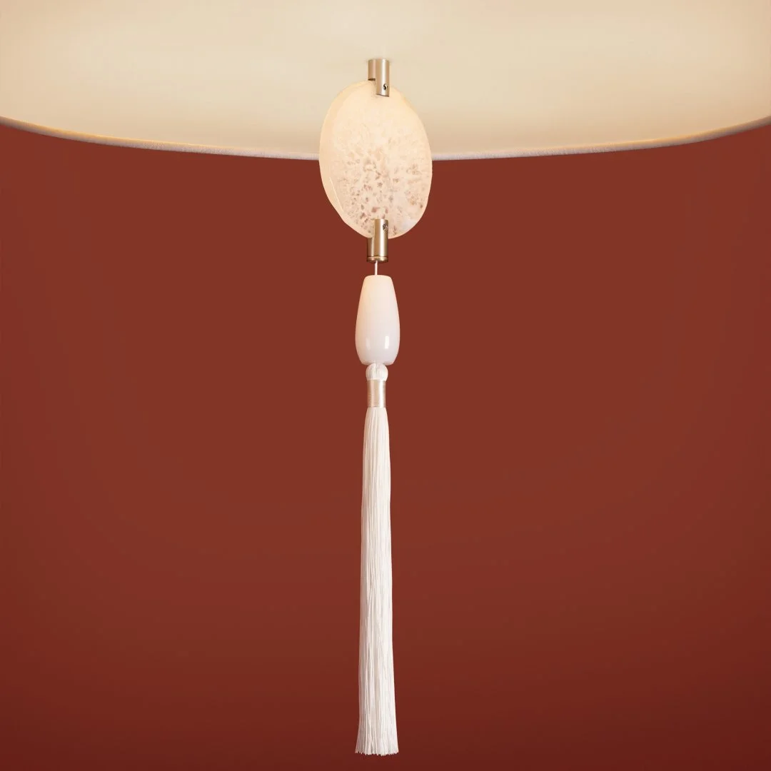 Металлическая арматура в цвете никель. Светильники с натуральным агатом, серым тканевым абажуром и декоративными кисточками . Лампы E14 (не в комплекте). Бра с регулируемой высотой.