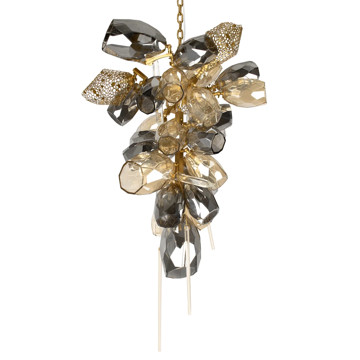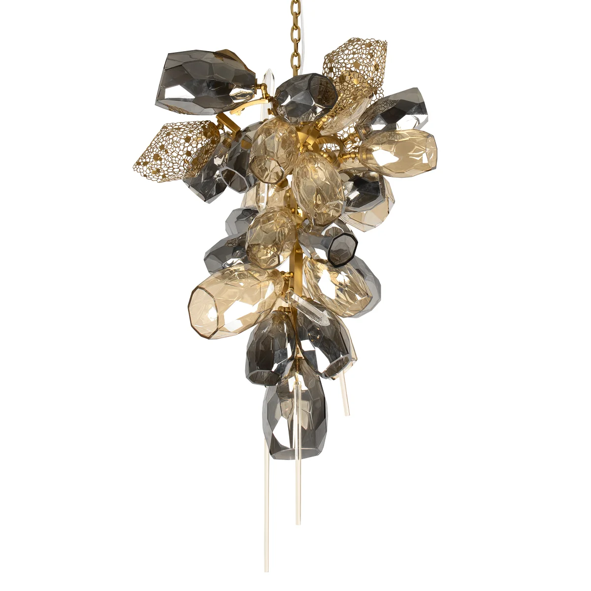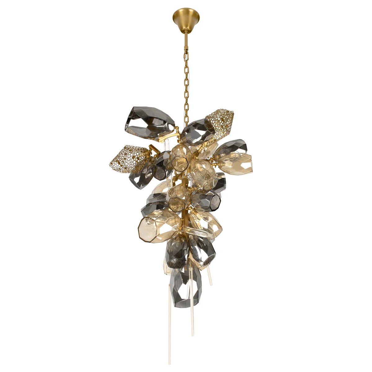 Подвесная люстра Britannica — гармоничный союз элегантного арт-деко и изысканного модерна. Дымчатые хрустальные плафоны и золотистая металлическая арматура создают неповторимый эффект легкости благодаря ажурным сотообразным вставкам. Светильник оснащён 30 лампами G9 по 5 Вт, обеспечивая общую мощность 150 Вт и освещение до 10 кв.м, идеально для современных интерьеров.