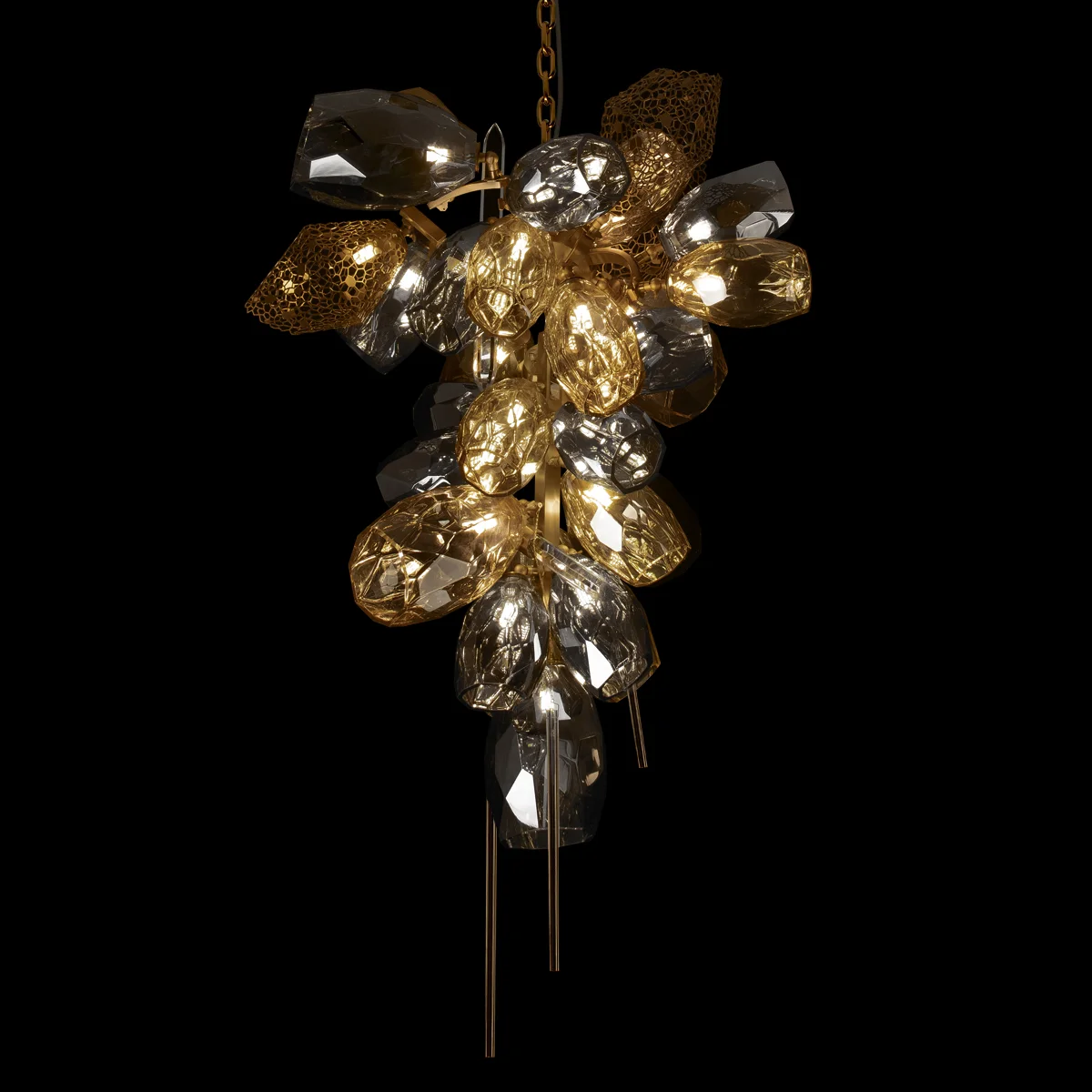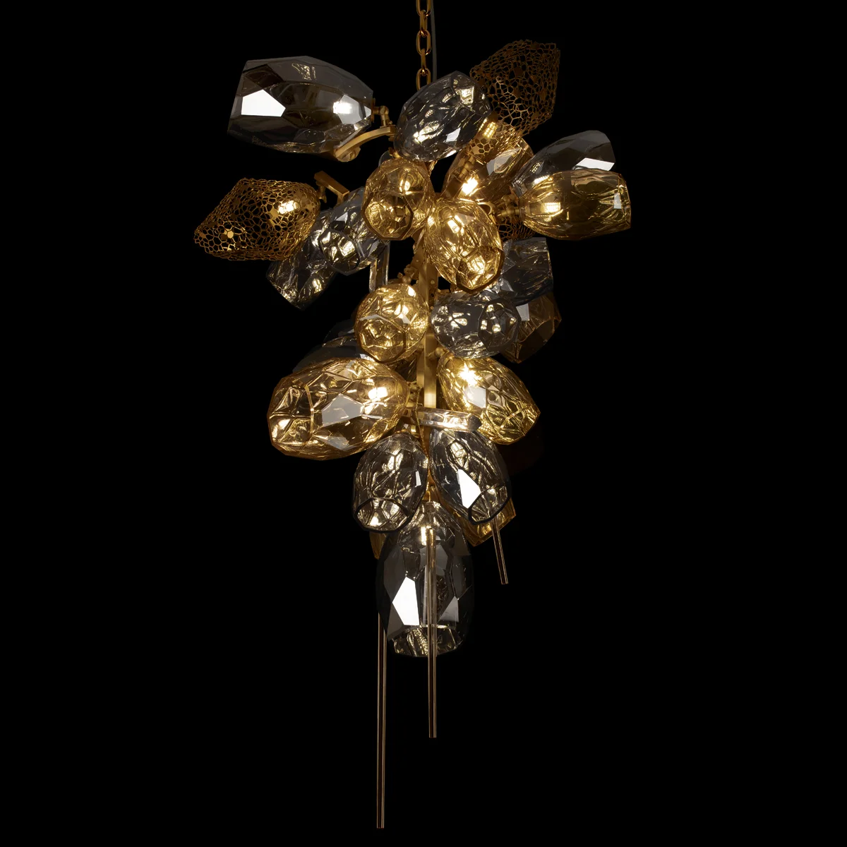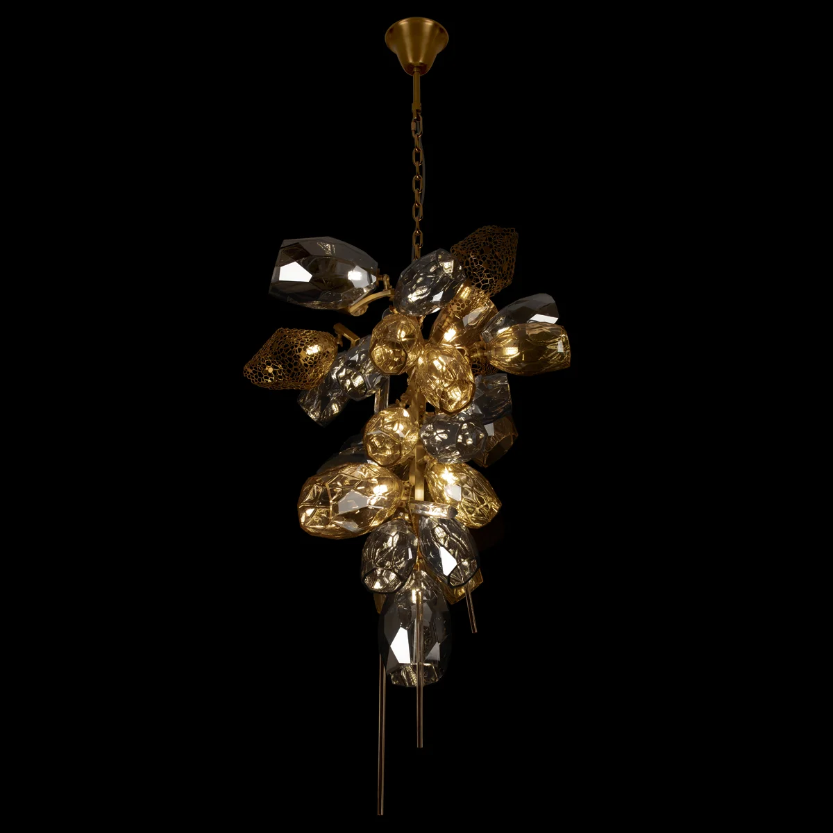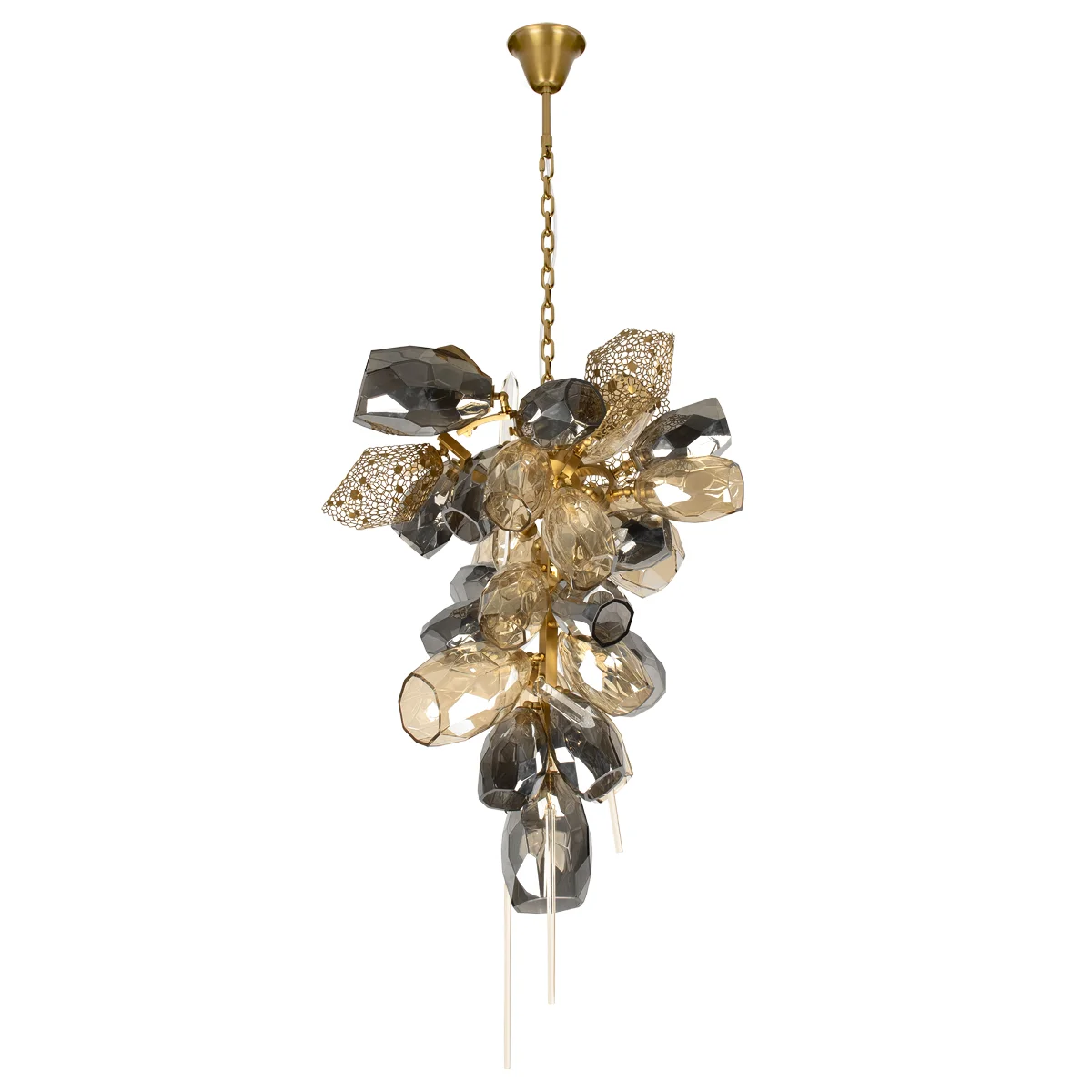 Подвесная люстра Britannica — гармоничный союз элегантного арт-деко и изысканного модерна. Дымчатые хрустальные плафоны и золотистая металлическая арматура создают неповторимый эффект легкости благодаря ажурным сотообразным вставкам. Светильник оснащён 30 лампами G9 по 5 Вт, обеспечивая общую мощность 150 Вт и освещение до 10 кв.м, идеально для современных интерьеров.