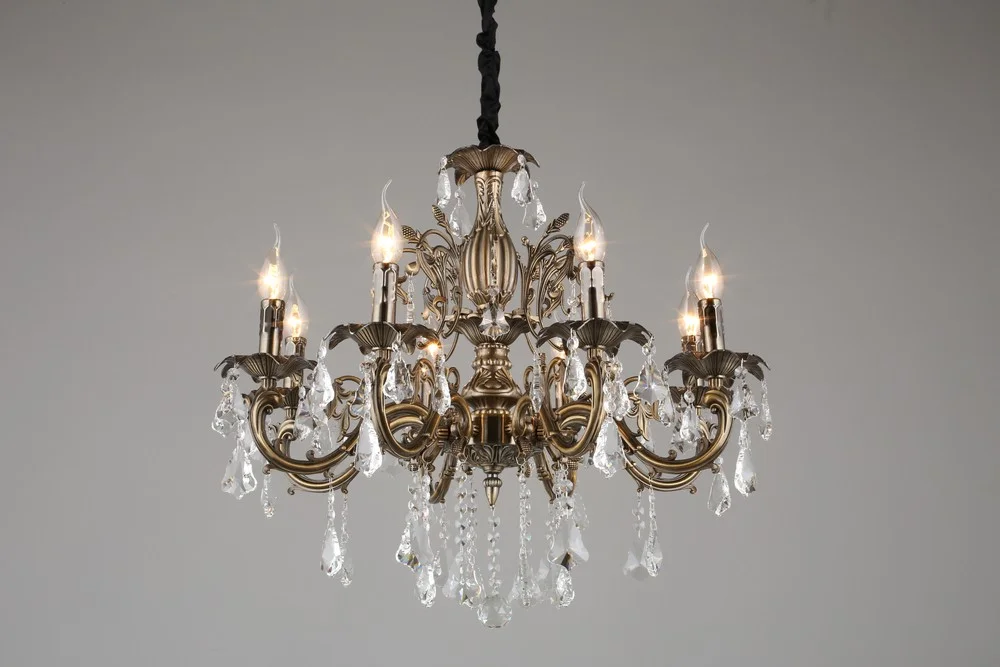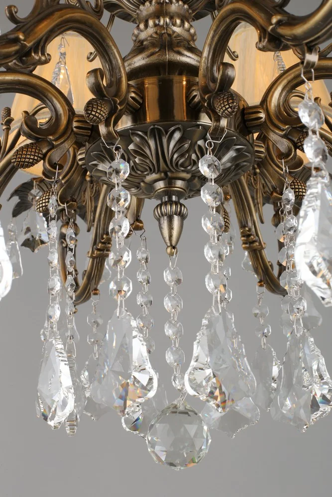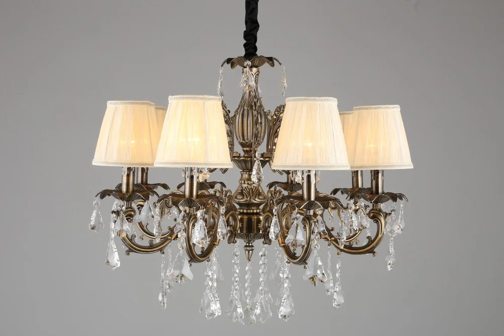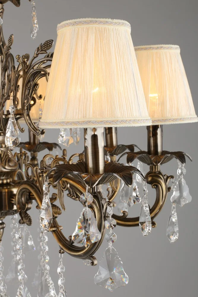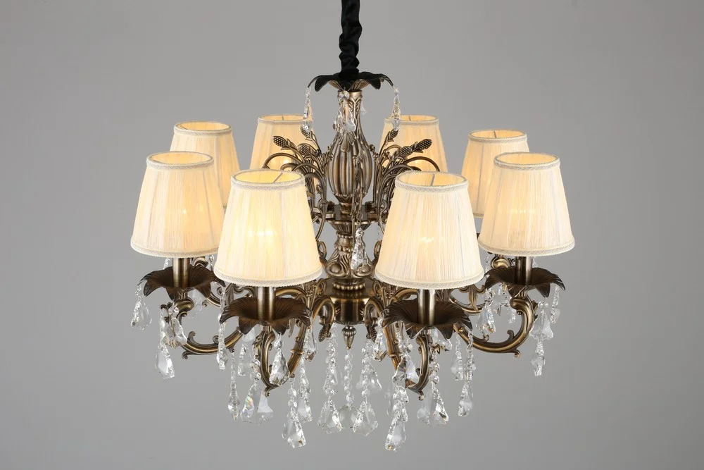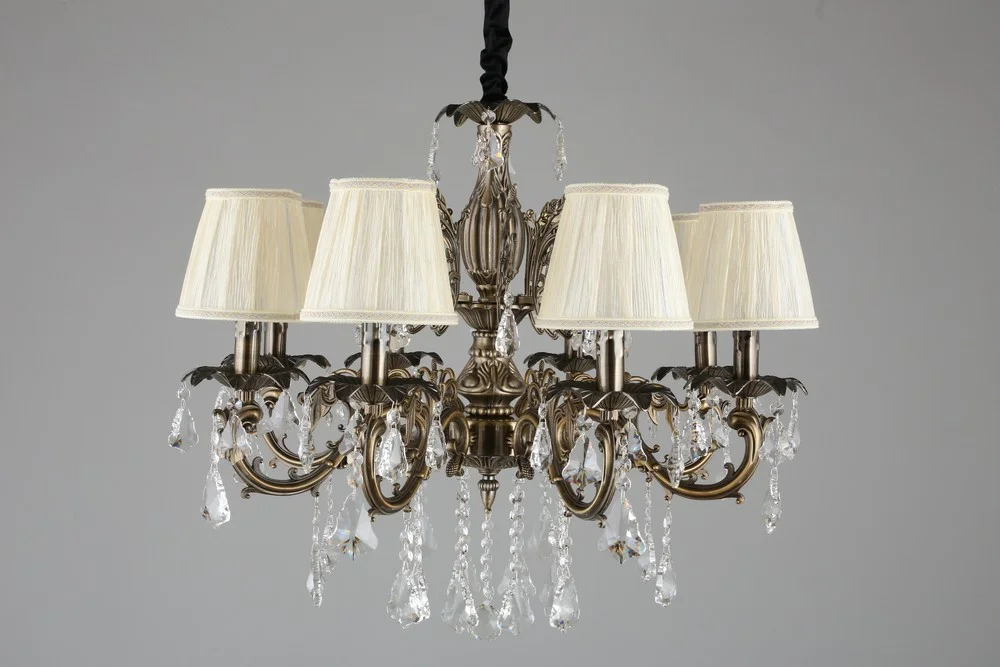 Эта классическая подвесная люстра станет истинным украшением вашего интерьера. Арматура в стиле под ковку выполнена из бронзового металла и дополнена бежевыми плафонами из красивой ткани. Хрустальные подвески и лампы "свеча на ветру" создают атмосферу изысканности и утончённости. Регулируемая высота позволяет адаптировать люстру под натяжные потолки.