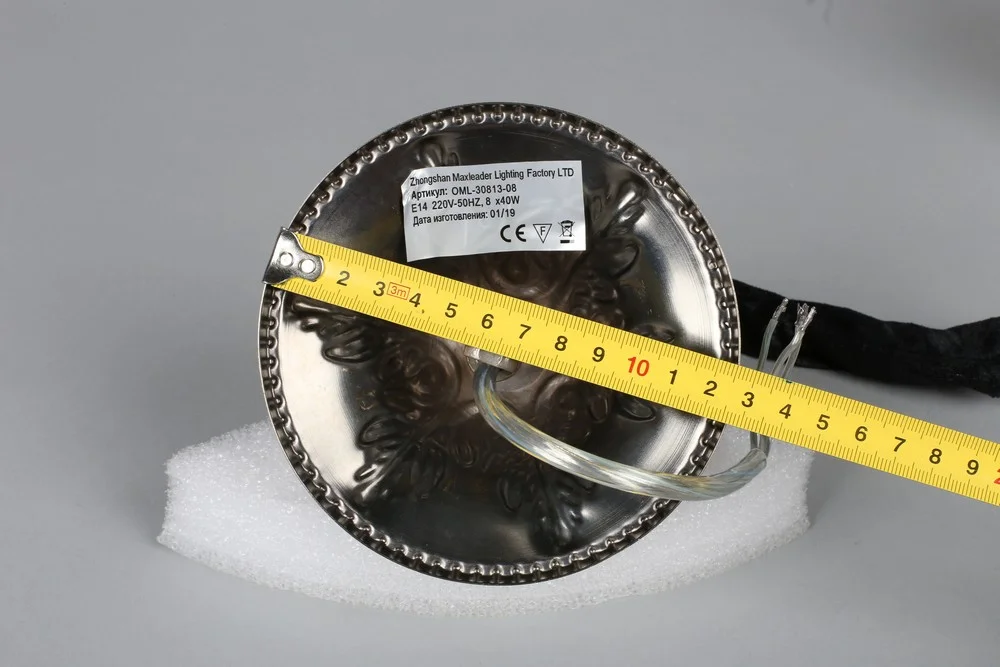 Люстра Omnilux Catanzaro обладает мощностью 320 Вт (8 ламп по 40 Вт), что обеспечивает освещение до 16 кв.м. Площадь освещения можно уменьшить, заменив лампы на светодиодные аналоги. Декоративный чехол скрывает цепь, придавая светильнику ещё более элегантный вид.