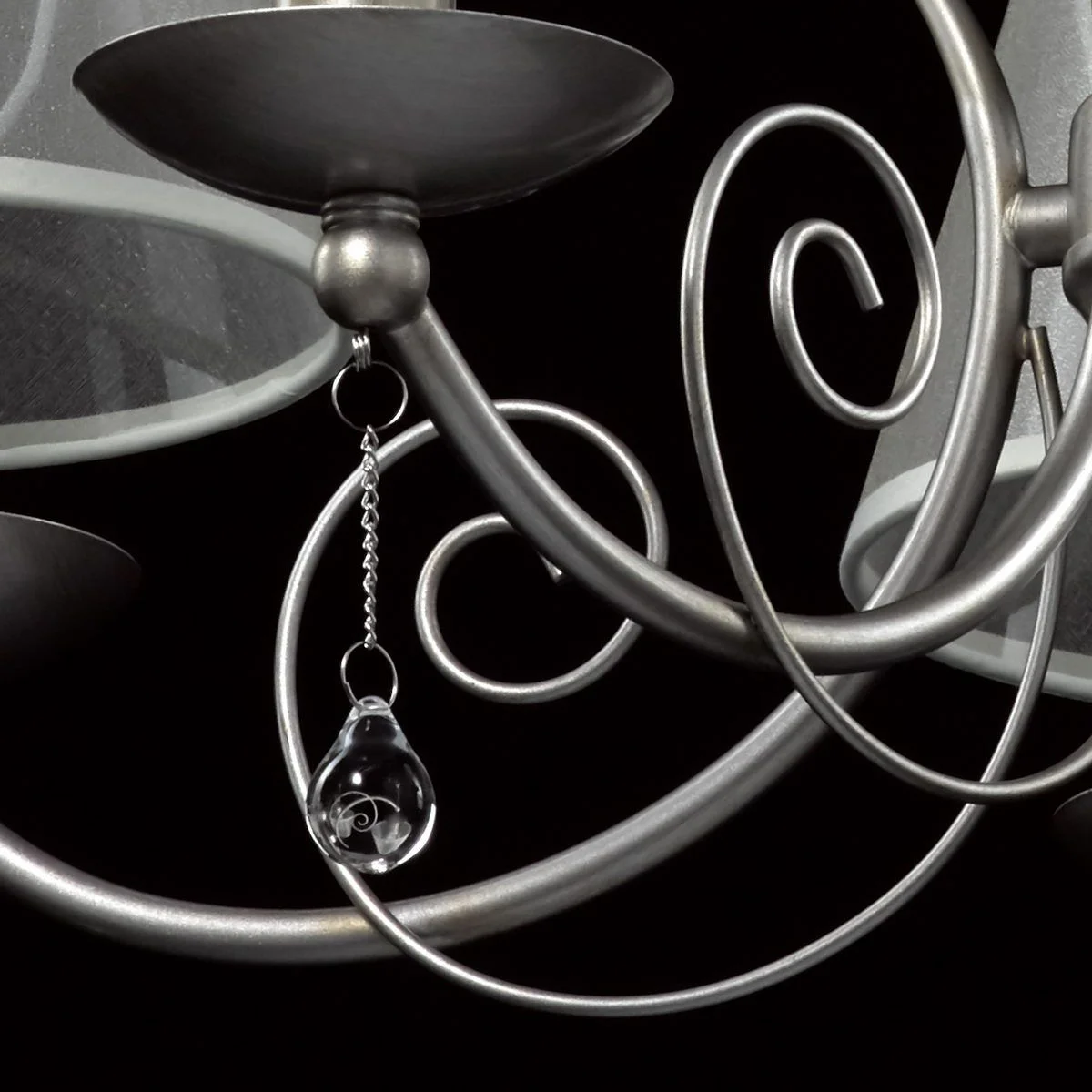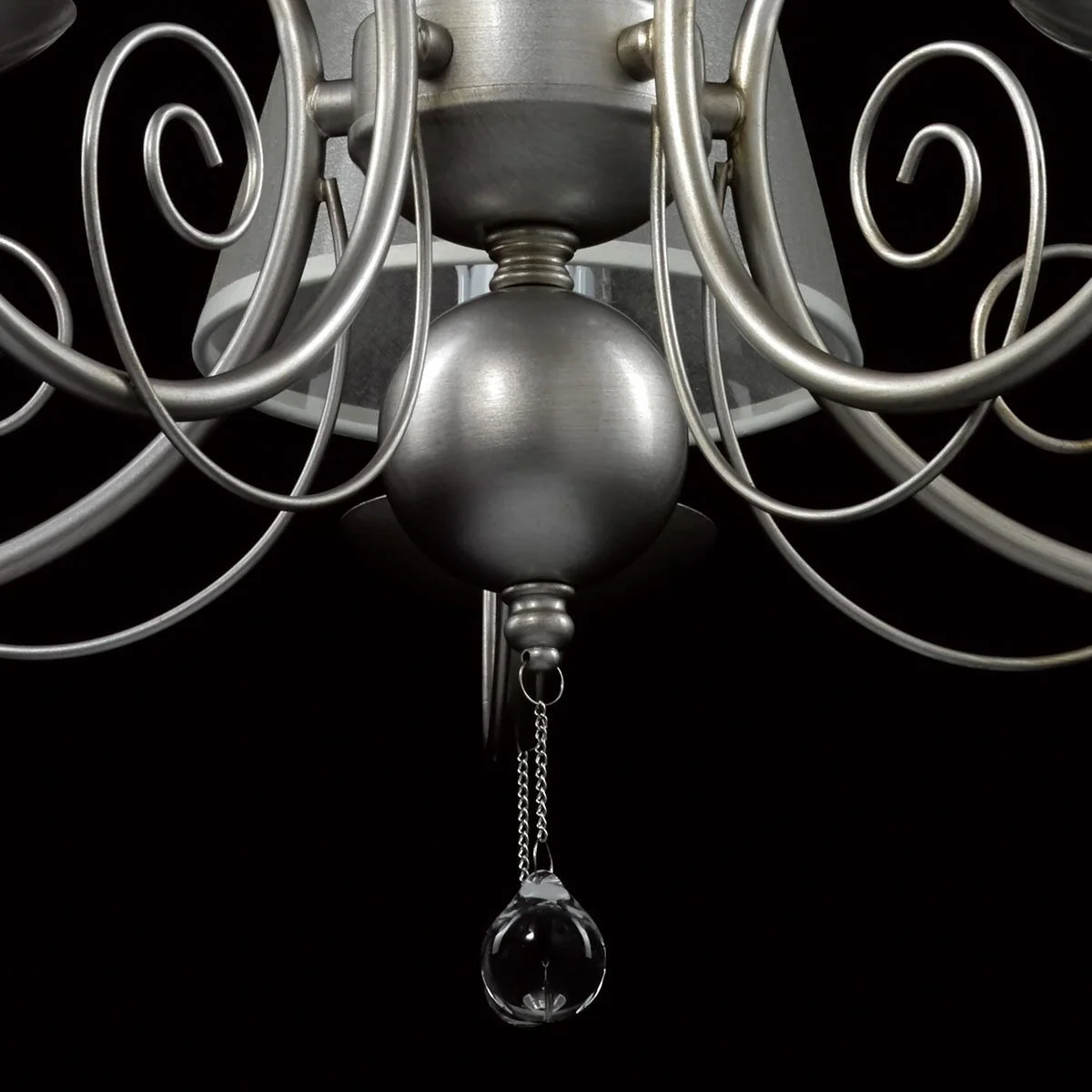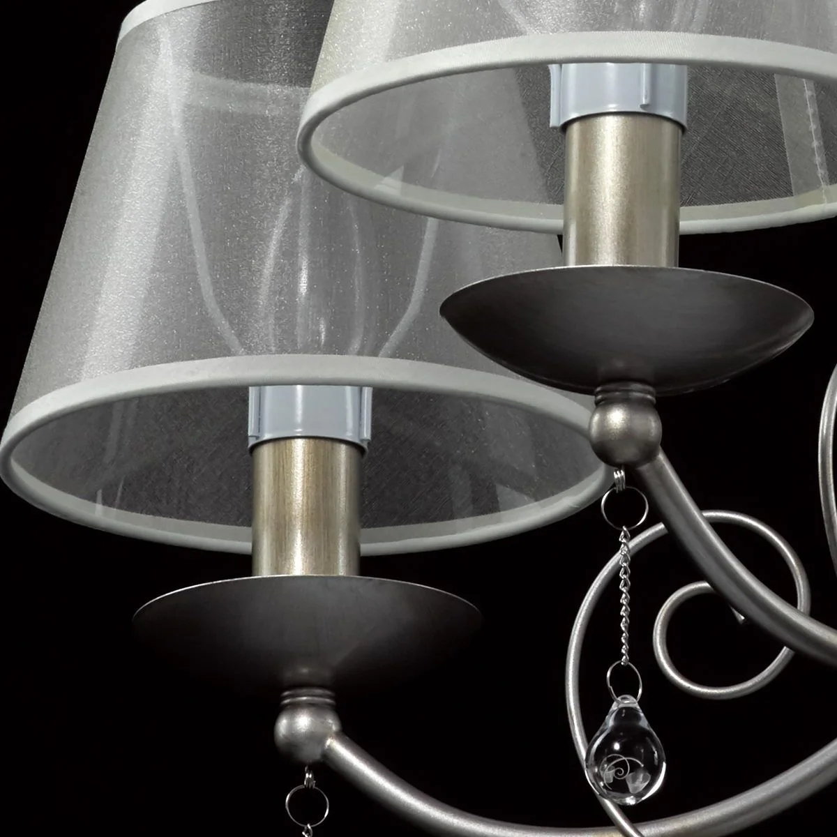 Основание бра выполнено из металла и обработано по технологии хай-лайт, где основной цвет перламутрового серебра, а декоративный - цвет кофе. Светильник декорирован двухслойным текстильным абажуром из органзы бежевого цвета с термостойким акрилом внутри и подвесками из прозрачного стекла. Абажур отделан кантом и прошит. Абажур съемный.