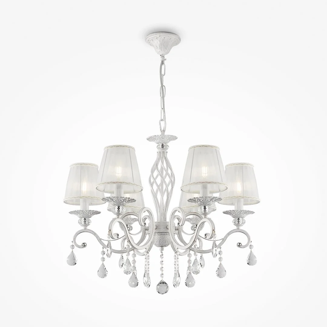 Люстра оснащена шестью лампами с цоколем E14 и мощностью по 40 Вт каждая, работающими при напряжении 220 В. Крепление на крюке обеспечивает надежную фиксацию, а вес светильника в 4,8 кг делает его удобным в установке. Особенностью серии Grace являются витиеватые сплетения металла в основании светильников и многочисленные подвески из кристаллов, придающие конструкции роскошный вид. Серия включает модели как с абажурами, так и без них, а возможность регулировки высоты путем изменения длины цепи делает эти люстры универсальными для любого помещения.