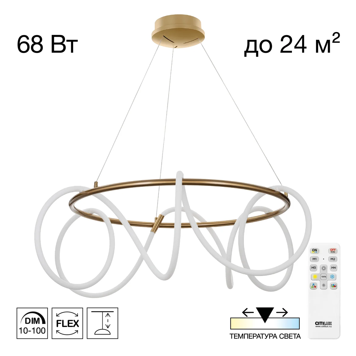 Диаметр люстры 80 см обеспечивает заметное присутствие в интерьере, а регулируемая высота от 50 до 150 см позволяет адаптировать светильник под любой потолок, включая натяжные. Светодиодный модуль с цоколем LED, всего 1 лампа, потребляет 68 Вт - энергоэффективно и современно. Плавное диммирование и изменение цветовой температуры (от 3000K до 5500K) создают универсальную атмосферу от теплого уюта до холодной свежести. Встроенный пульт управления с памятью режимов и таймером - это удобство и комфорт в использовании.