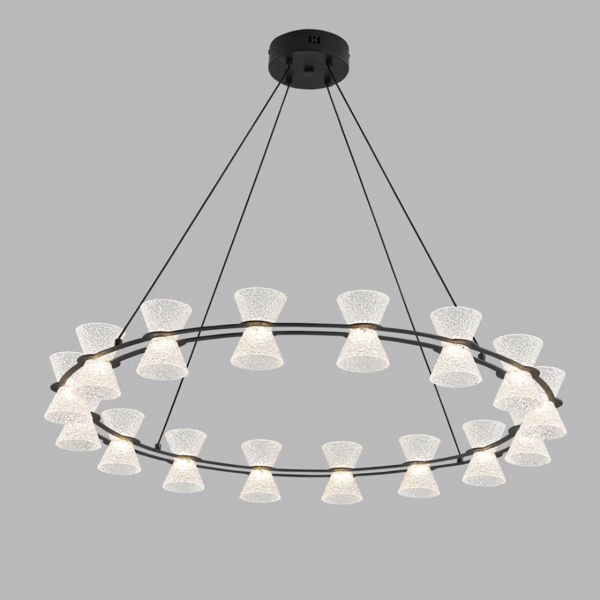 Воздушная, легкая модель VINORA - необычный и заметный предмет дизайна интерьера. Прозрачные "плафоны- стаканчики", изготовленные из акрила, мягко рассеивают свет, делая освещение приглушенным, мягким и приятным. Тонкие основания-кольца и вертикальные тросы поддерживают легкость всей конструкции, не утяжеляя ее.