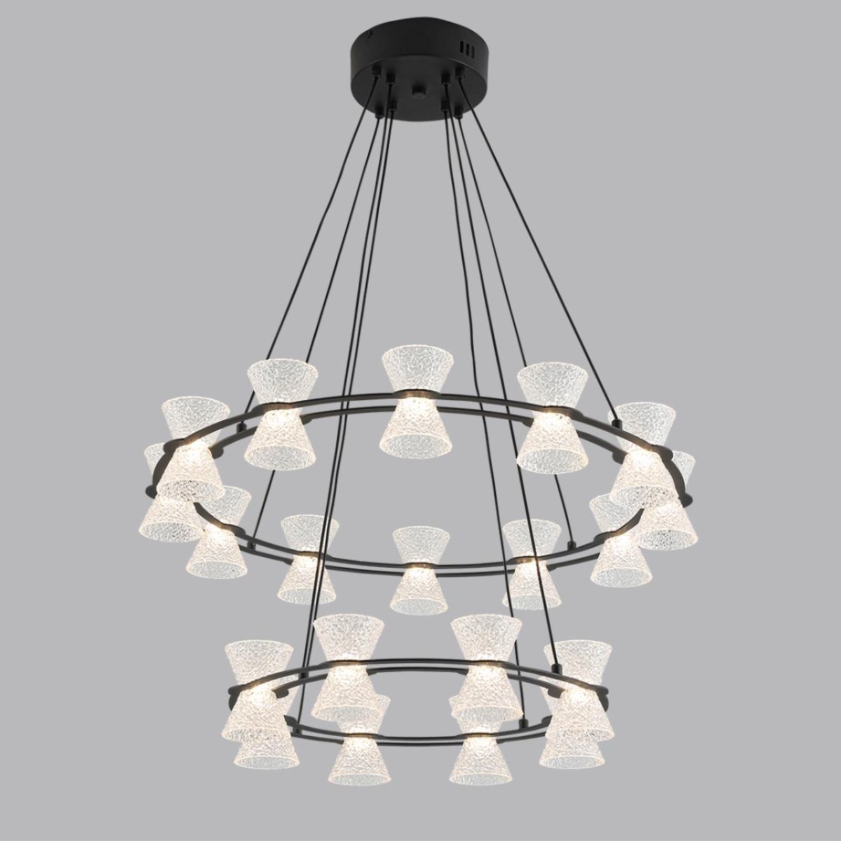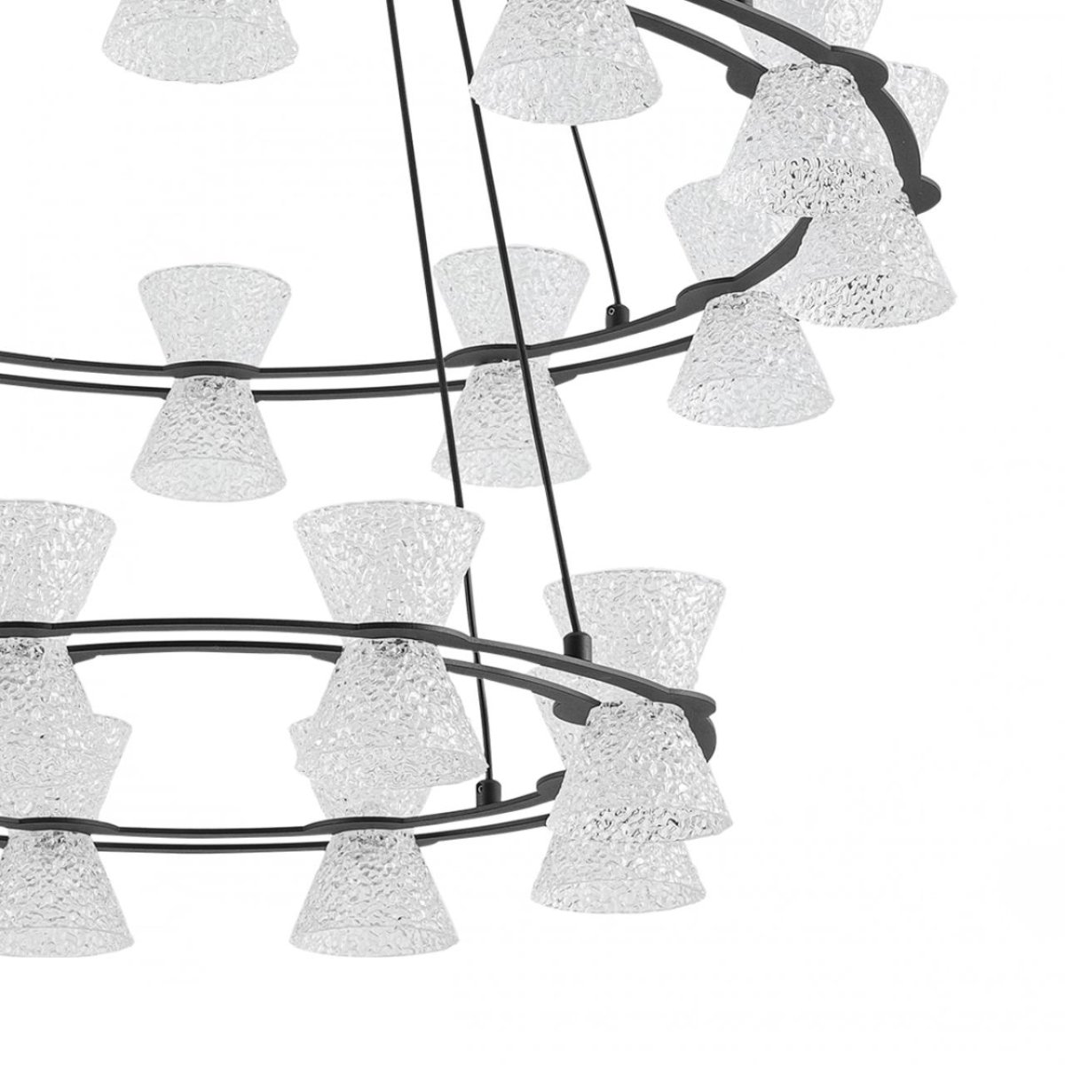 Воздушная, легкая модель VINORA - необычный и заметный предмет дизайна интерьера. Прозрачные "плафоны- стаканчики", изготовленные из акрила, мягко рассеивают свет, делая освещение приглушенным, мягким и приятным. Тонкие основания-кольца и вертикальные тросы поддерживают легкость всей конструкции, не утяжеляя ее.