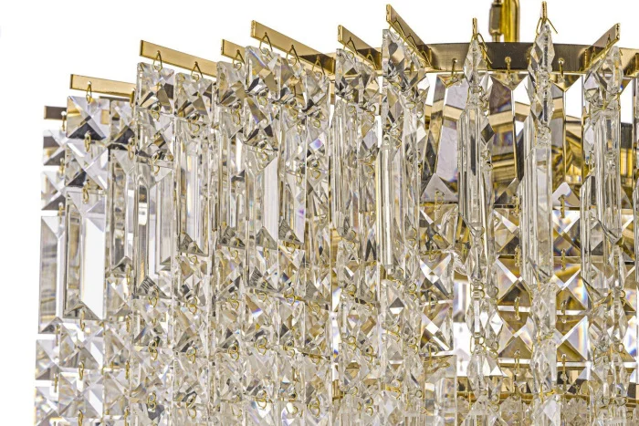 Люстра Maggio E 1.5.50.100 G из серии Maggio Dio D Arte — это воплощение классической роскоши и утонченности. Изящные хрустальные прямоугольные кристаллы, крупными нитями спускающиеся по окружности, создают прозрачный абажур, который наполняет пространство сиянием и светом. Золотая металлическая арматура гармонично сочетается с хрустальной основой, придавая изделию особую элегантность и утонченность.