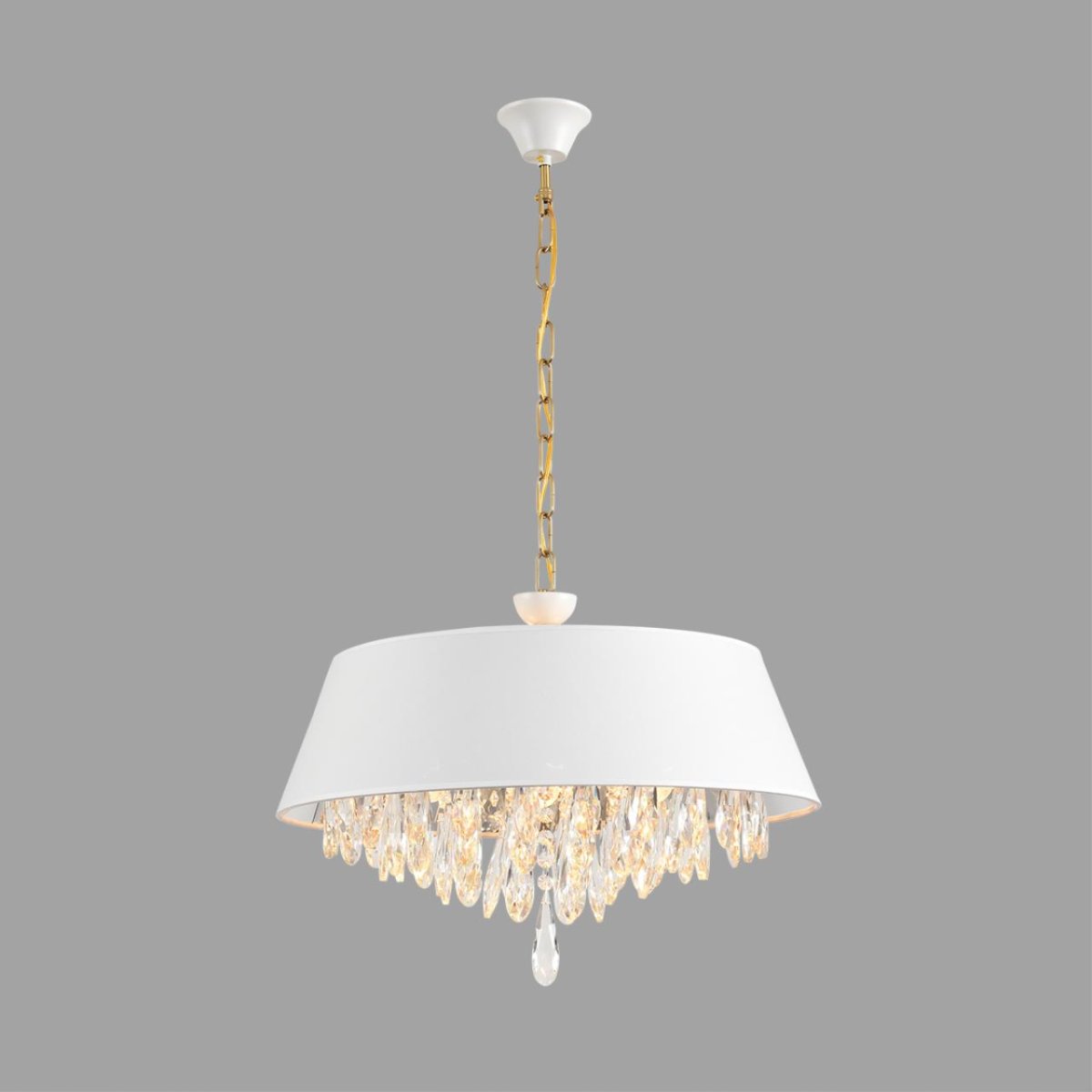 Линия MITRIM — это изысканное сочетание классики и современности, которое дизайнеры могут использовать для создания уютных и стильных интерьеров. Белый абажур из ткани и хрустальные подвески придают светильнику элегантность и легкость. Внутри абажур серебристо-зеркального цвета, что усиливает игру света, умножая его кратно. Благодаря своему дизайну, светильник становится центральным элементом комнаты. Он идеально подходит для столовых зон, гостиных или спален.