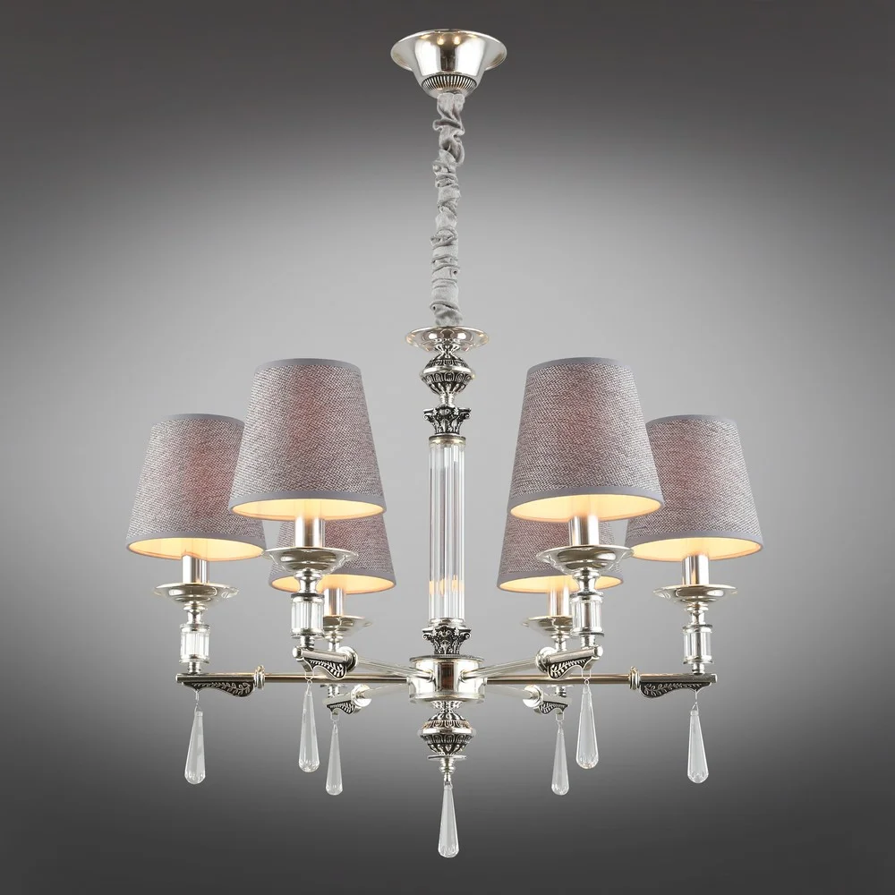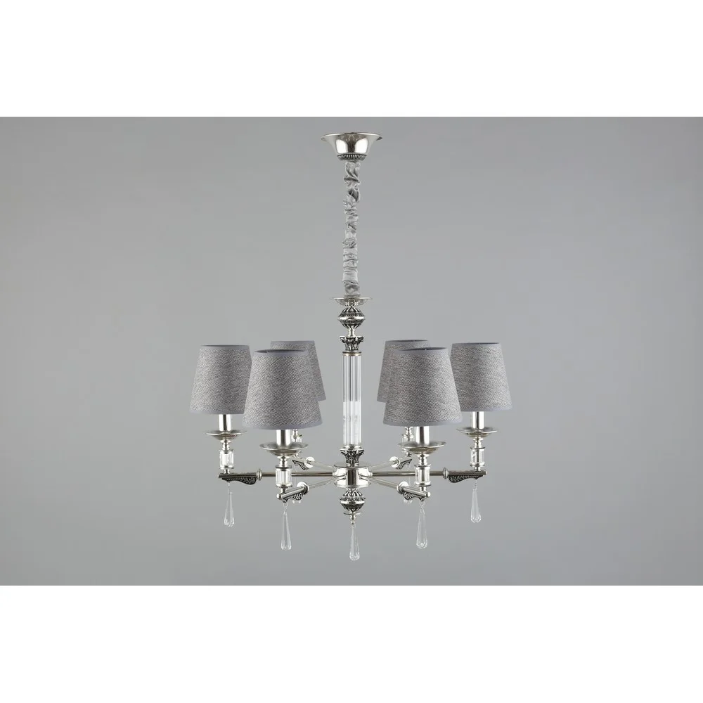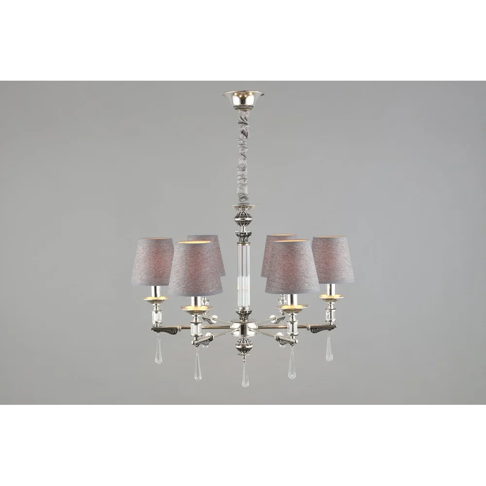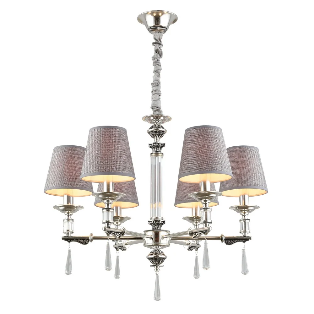 Мощность светильника составляет 240 Вт (6 ламп по 40 Вт каждая), обеспечивая яркое и уютное освещение. Плафон из ткани и металлические элементы в серебряном цвете подчеркивают элегантность и стиль, создавая утонченную атмосферу в вашей гостиной, кабинете или спальне. Хрустальные капли завершают образ, играя светом и добавляя волшебства.