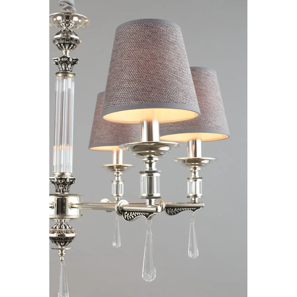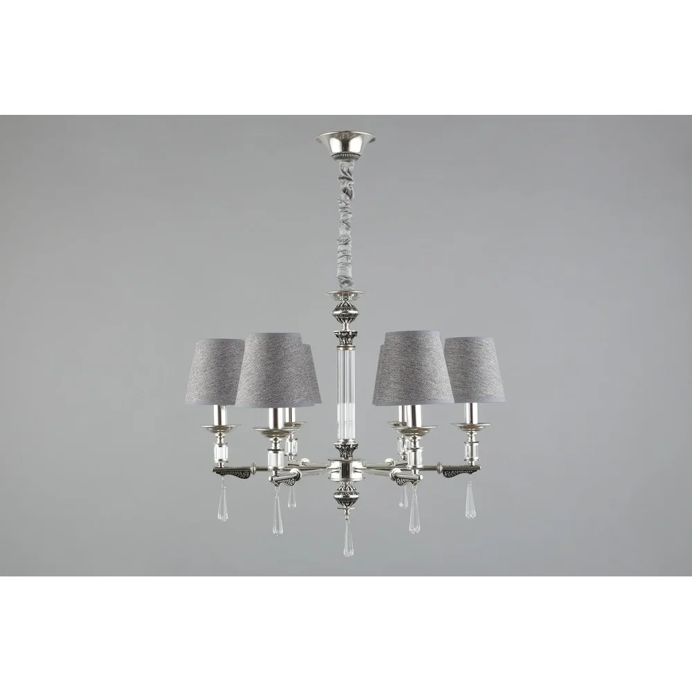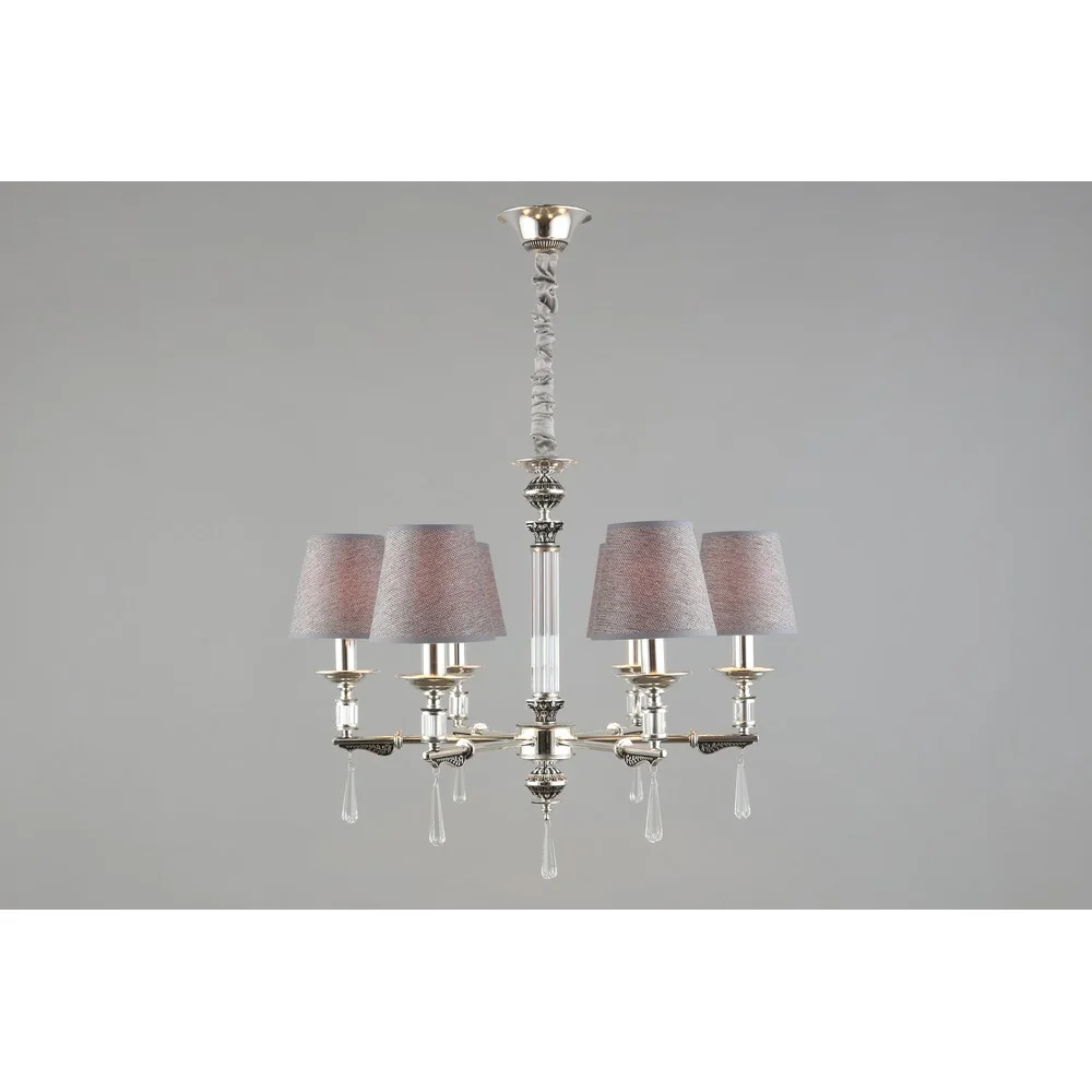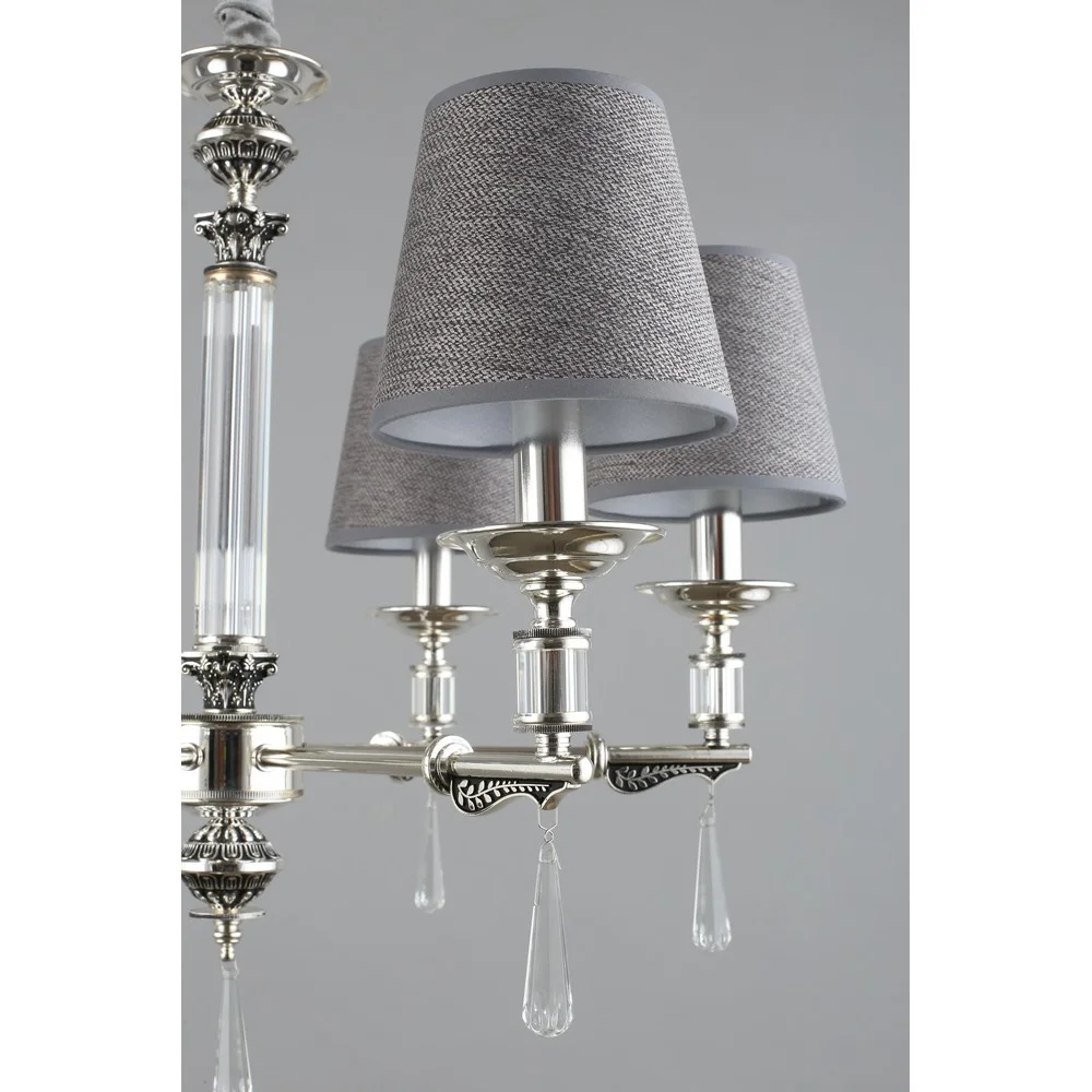 Мощность светильника составляет 240 Вт (6 ламп по 40 Вт каждая), обеспечивая яркое и уютное освещение. Плафон из ткани и металлические элементы в серебряном цвете подчеркивают элегантность и стиль, создавая утонченную атмосферу в вашей гостиной, кабинете или спальне. Хрустальные капли завершают образ, играя светом и добавляя волшебства.