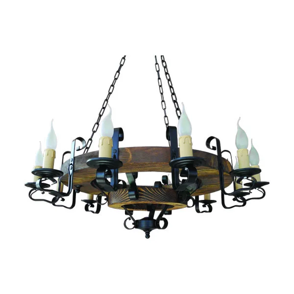 Люстра подвесная Ш-12 Тарсьма в стиле Кантри. Рекомендуется для установки в прихожей, кухне, гостиной или спальне, будет идеально дополнять светильники серии от фабрики Тарсьма. Цвет плафона - Без плафона, материал плафона - , цвет арматуры - Коричневый, материал арматуры - Дерево. В светильнике 12 ламп мощностью - 40 Вт, с цоколем E14, площадь освещения до 24 кв.м, размеры светильника - 330*90*900* мм. Люстру Ш-12 для интерьера в стиле Кантри, можно купить с доставкой по Москве и России в нашем интернет магазине.