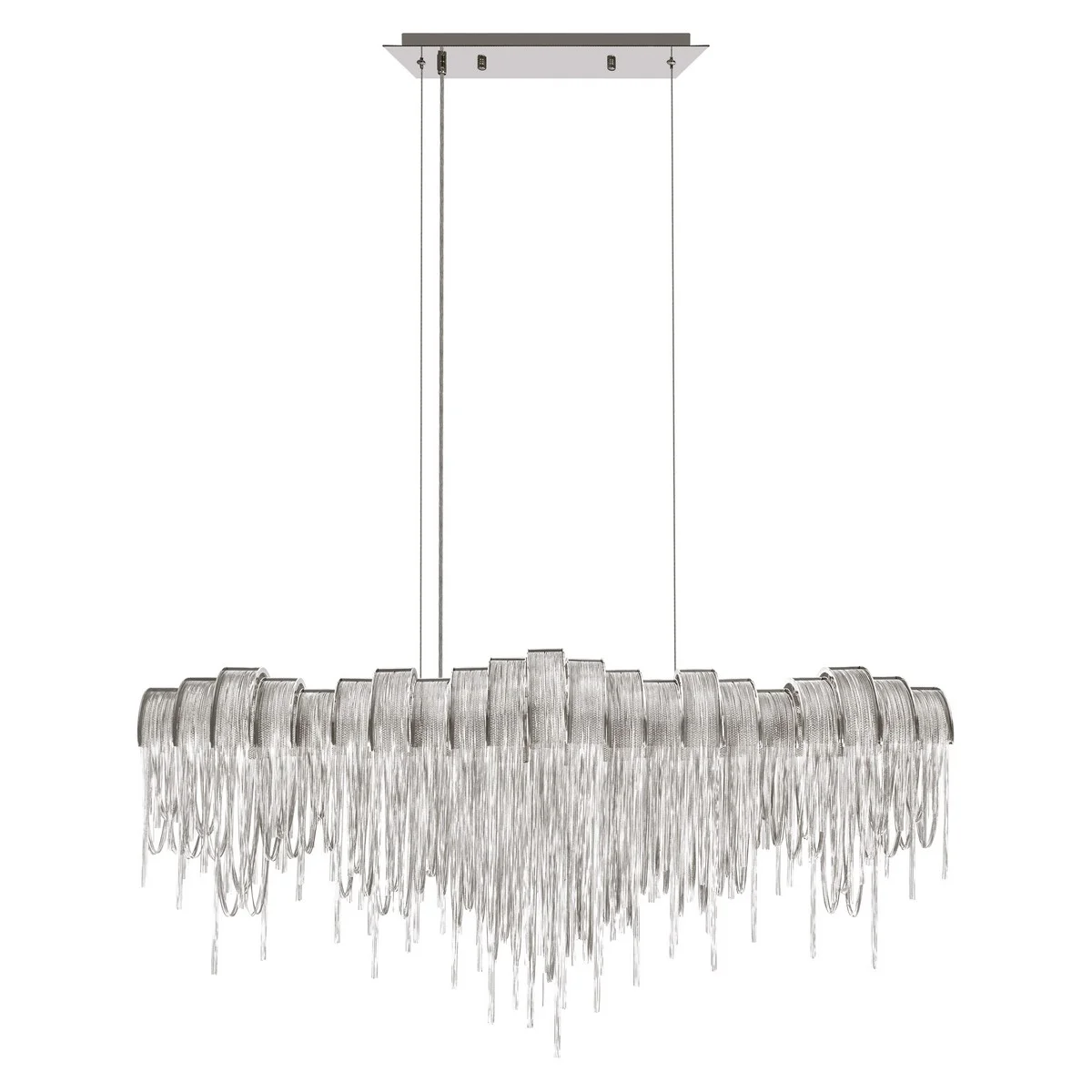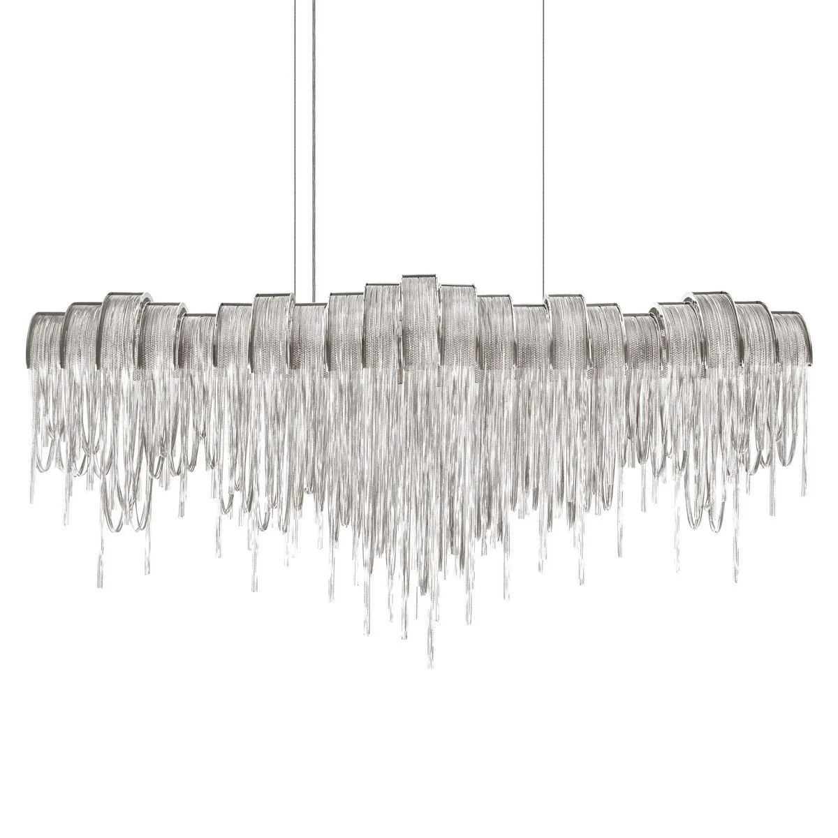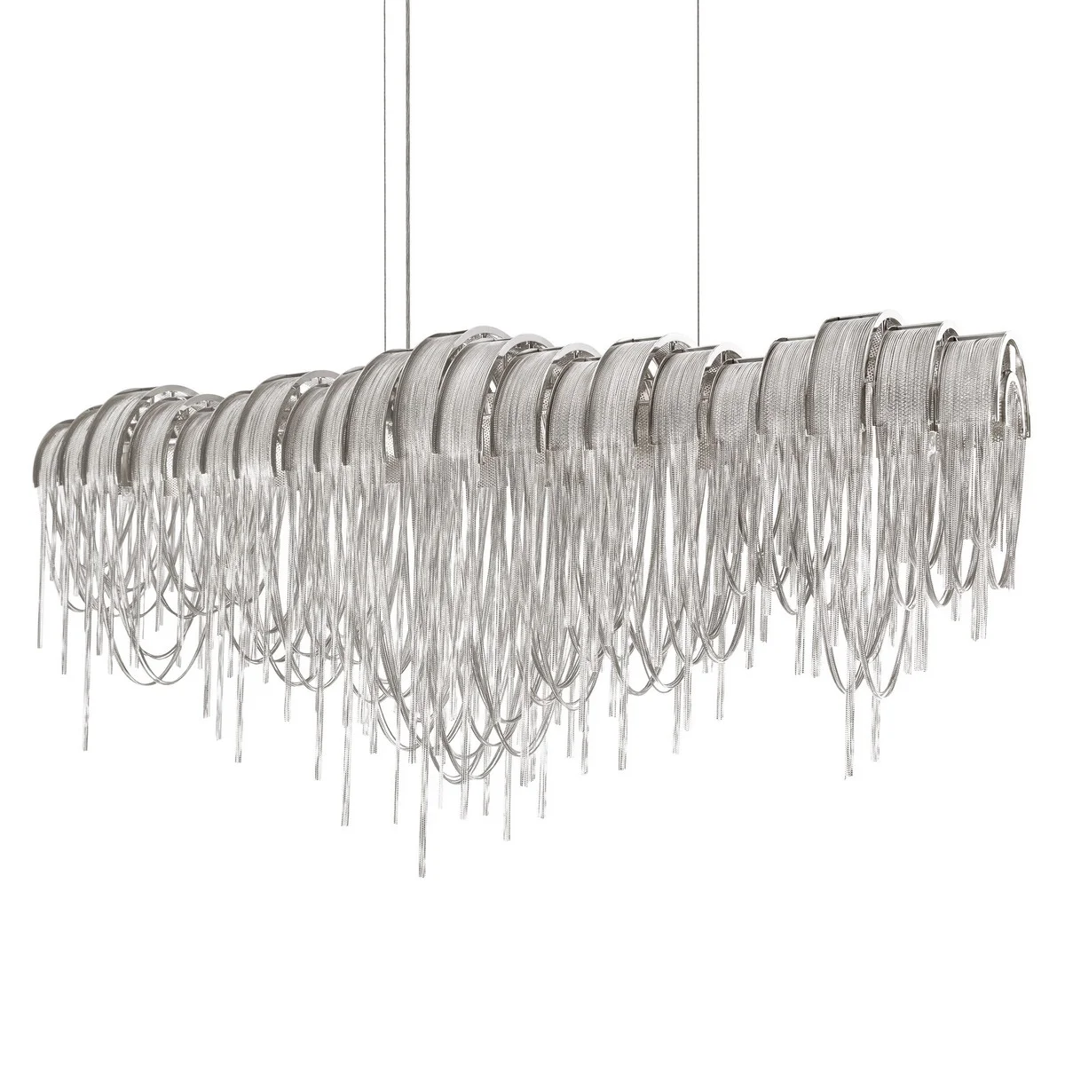 Эта подвесная люстра Volver — настоящий арт-объект, где современный стиль арт-деко встречается с изящной технологией. Легкие металлические цепочки в никелевой отделке создают эффект водопада, добавляя комнате неповторимую атмосферу. Размер 1150x250 мм с регулируемой высотой до 3476 мм идеально впишется даже в натяжной потолок.