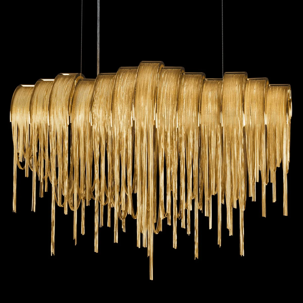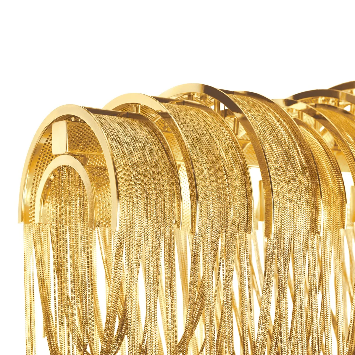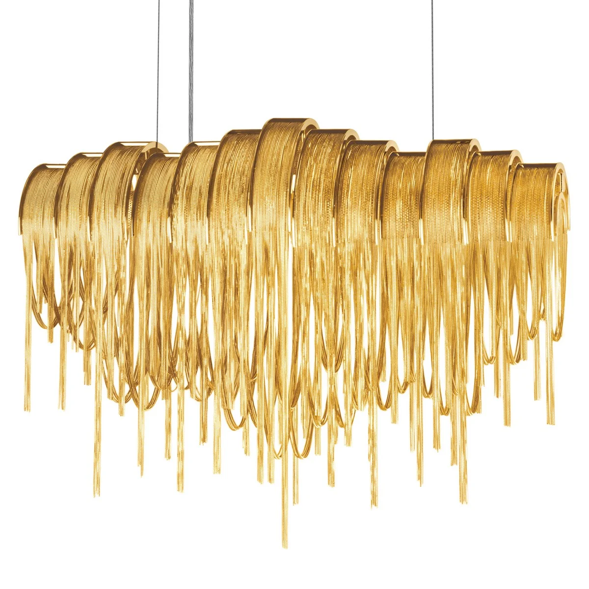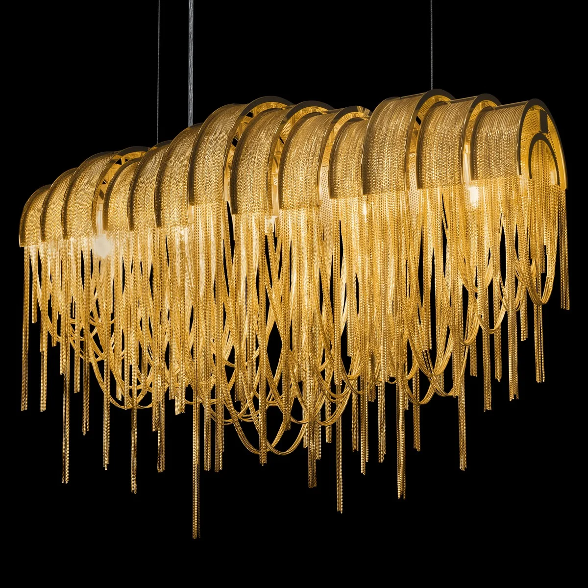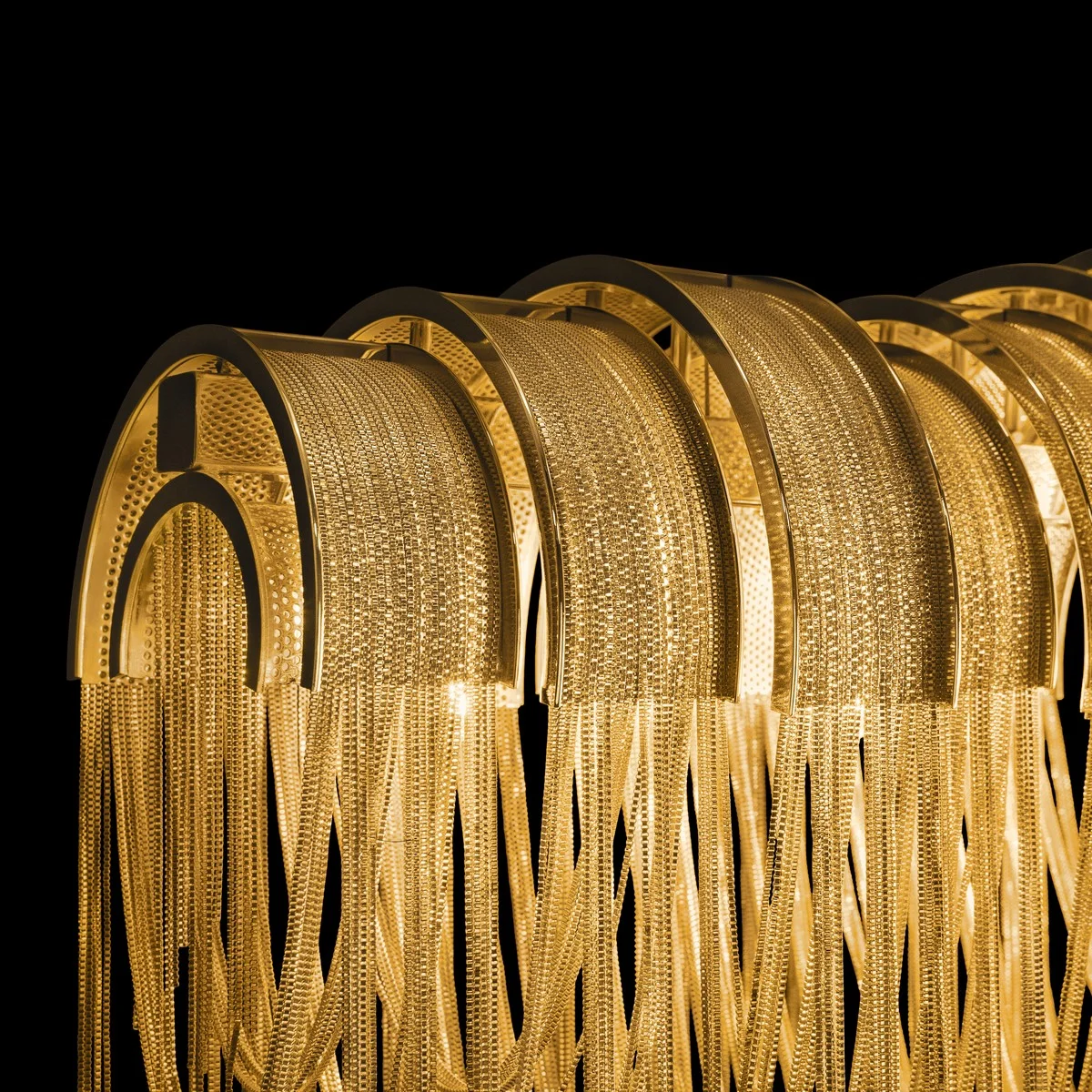 Особенность модели — изящные золотые цепочки, формирующие геометрический водопад, создающий уникальную атмосферу и служащие одновременно декоративным и конструктивным элементом. Эта люстра прекрасно подчеркнет дизайнерское решение, объединив в себе технологическое совершенство и художественную ценность, и станет центром композиции в вашем помещении.