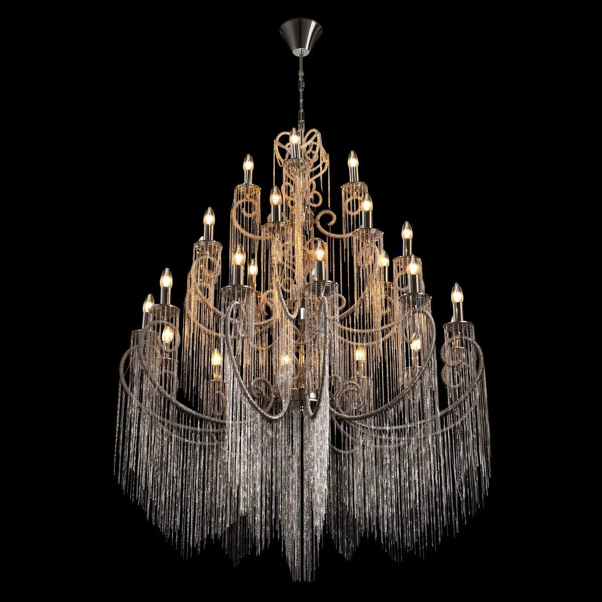 Габариты люстры внушительны: диаметр 1145 мм и регулируемая высота от 1380 до 4380 мм позволяют ей стать центральным акцентом любого интерьера. Восходящее направление света, 24 лампы с цоколем E14 и суммарное энергопотребление 960 Вт гарантируют насыщенное, равномерное освещение. Многослойная структура металлических цепочек не только подчеркивает уникальный дизайн, но и отражает качество исполнения, а регулируемая длина подвеса позволяет адаптировать светильник под любой объем помещения.