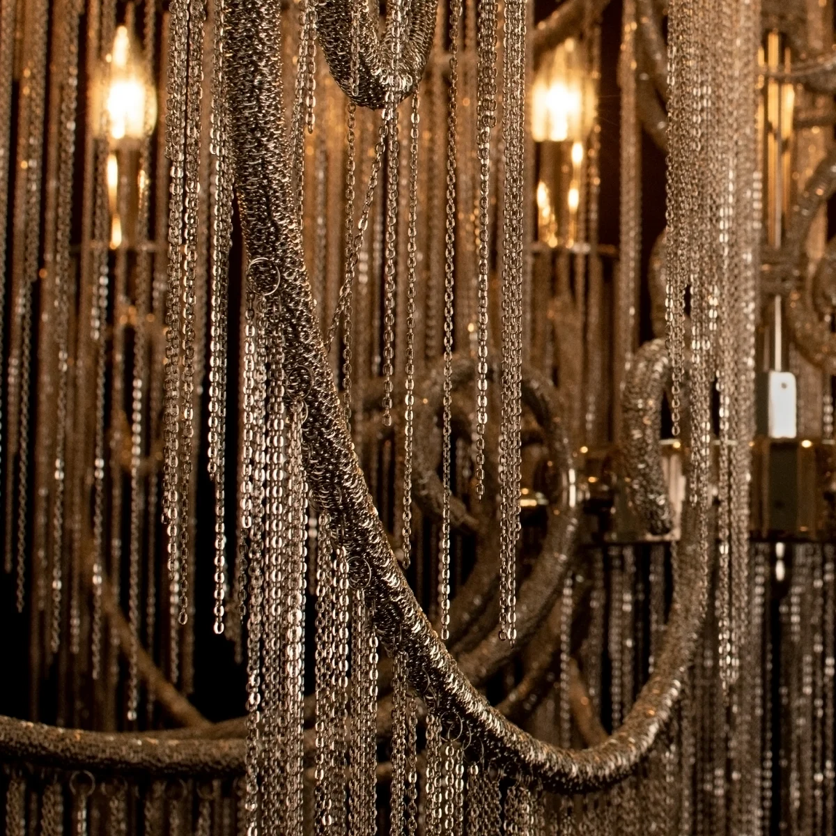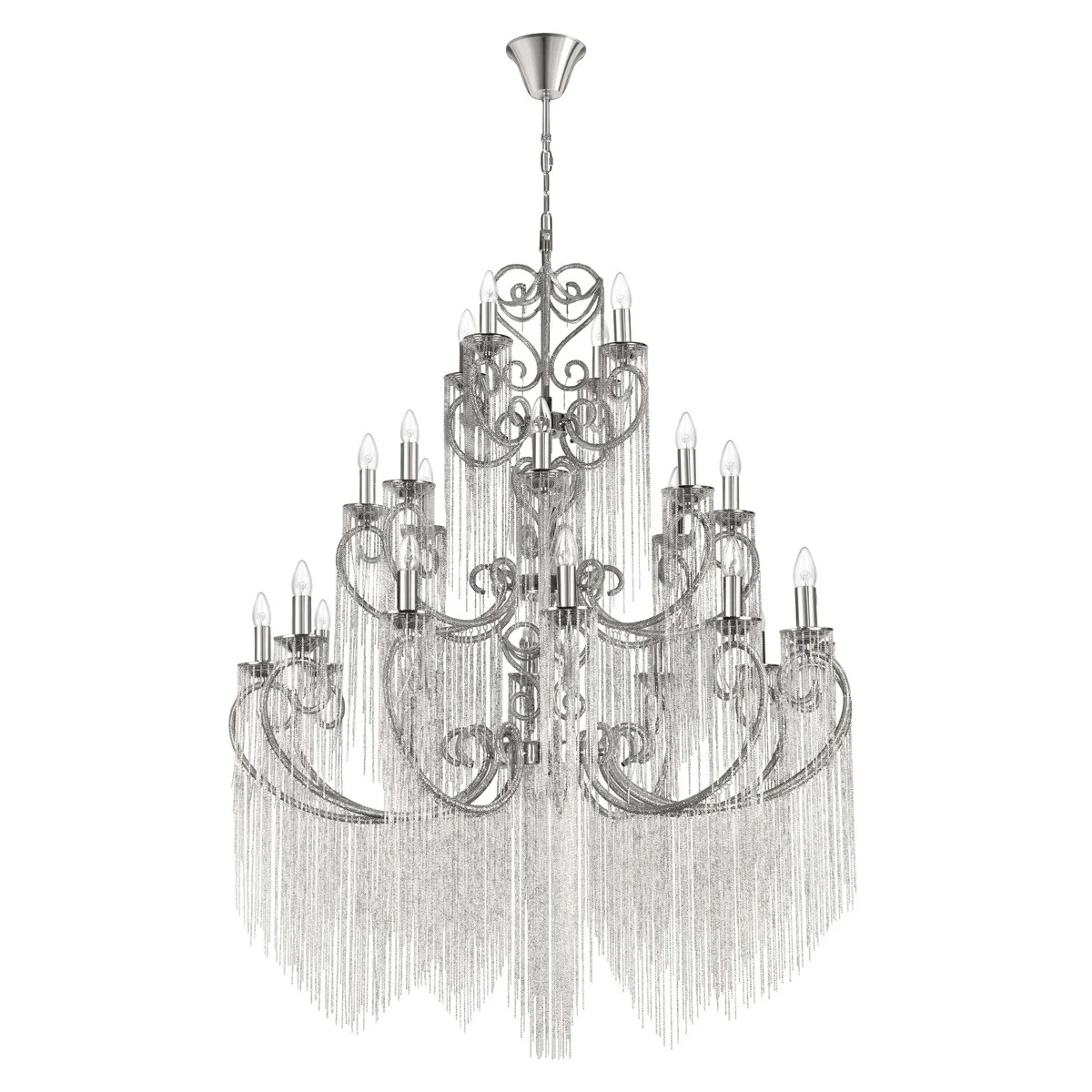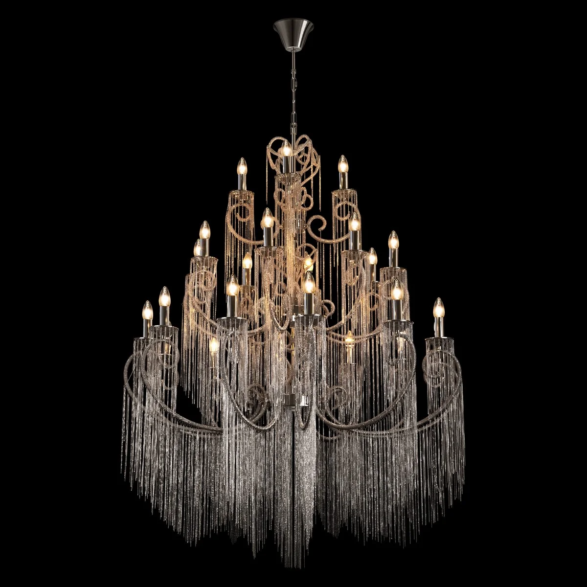 Люстра подвесная Wonderland из коллекции Wonderland LOFT IT воплощает стиль арт-деко с характерным сочетанием строгих геометрических форм и выразительной фактуры. Никелированная металлическая арматура в паре с каскадом из металлических цепочек создают эффект живого водопада, который наполняет пространство легкостью и глубиной. Благодаря общей мощности 960 Вт (24 лампы по 40 Вт), светильник обеспечивает освещение до 48 квадратных метров, что идеально подходит для просторных гостиных или залов с натяжными потолками.