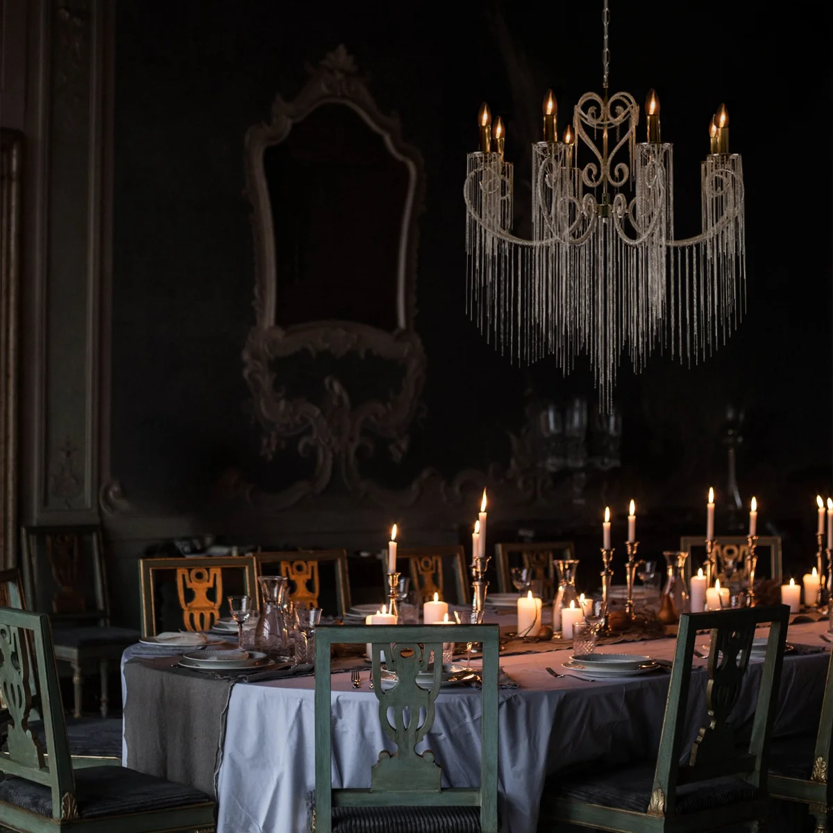 Габариты светильника — диаметр 765 мм, высота регулируется от 620 до 3620 мм, что позволяет гармонично вписать его в помещения с разной высотой потолков, включая натяжные. В люстре используются восемь ламп с цоколем E14 и мощностью по 40 Вт каждая, направляющих свет вверх для мягкого и равномерного распределения. Вес 7 кг и надежное крепление на планку обеспечивают прочность и стабильность. Металлическая арматура высокого качества гарантирует долговечность, а дизайн с эффектом водопада создает выразительный акцент в интерьере, наполняя пространство особой атмосферой уюта и стиля.
