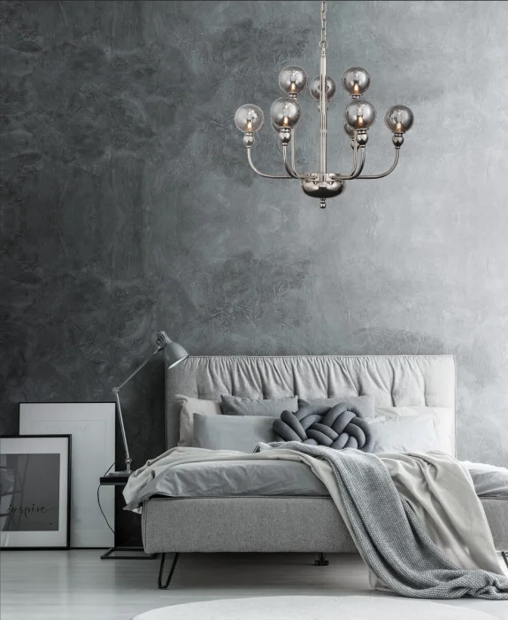 Размеры люстры — 680 мм в диаметре и регулируемая высота до 1100 мм — делают её заметным акцентом в интерьере, не перегружая пространство. Светильник оснащён 9 галогенными лампами с цоколем G9, каждая мощностью 5 Вт, что даёт общее энергопотребление 45 Вт. Благодаря конструкции на цепи и нейтральному белому свету (4000 К) светильник прекрасно впишется в современные интерьеры и подчеркнёт индустриальный характер комнаты. Использование качественного металла и стекла гарантирует долговечность и высокую экологичность светильника.