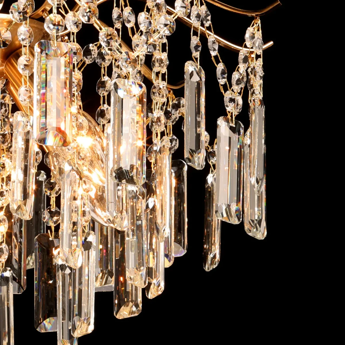 Металлическое основание потолочной люстры гальванизировано в цвет латуни. Светильник декорирован прозрачным хрусталем разной формы.