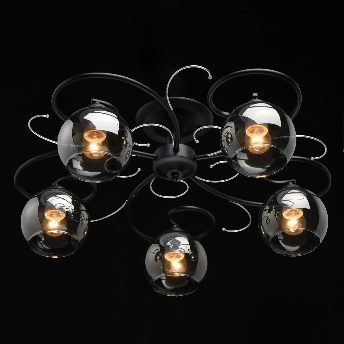 Преимущества модели Актуальный черный цвет основания актуален для интерьеров различной стилистики. Оригинальная конструкция с тонированными плафонами дымчатого цвета обеспечивает мягкий световой поток Металлический декор в цвет серебра создает дополнительный акцент. Компактная высота для стандартной высоты потолков. Заменяемые источники света удобны в эксплуатации. Полная семья из бра и потолочных светильников на 3 и 5 ламп.Технология производства Основание светильника выполнено из металла и окрашено в черный цвет. Декоративные элементы окрашены в цвет серебра. Стеклянные плафоны круглой формы гальванизированы в дымчатый цвет.Материалы Основание/металл/черный, серебро. Плафон/стекло/дымчатый.