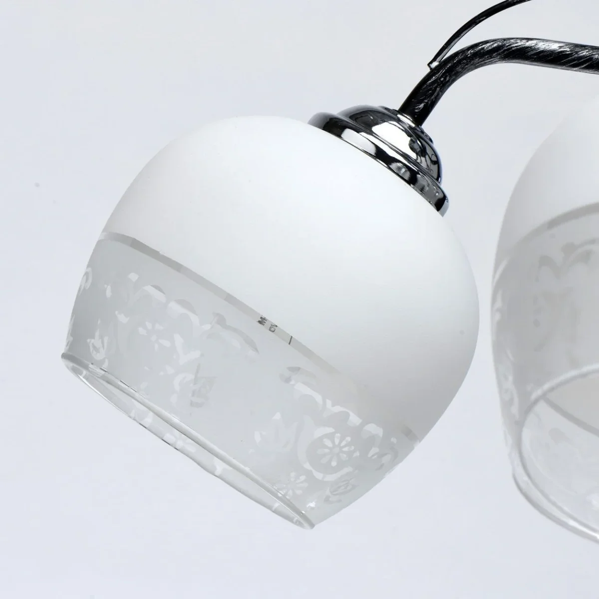 Актуальное сочетание металлического основания черного цвета и хрома. Плафоны комбинированного стекла белого и матового с прозрачным рисунком на канте мягко рассеивают световой поток. Декор из стекла создает дополнительный акцент. Компактная высота модели идеальна для стандартной высоты потолка.