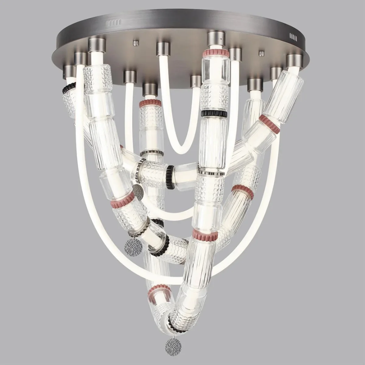 Силуэты светильников линии Collier обыгрывают образ колье, сверкающего многогранными элементами из стекла, металла и керамики. Линия выполнена в двух трендовых цветах: сатинированная латунь и сатинированный темный никель. Каскадный светильник линии Collier создан для просторных интерьеров с высокими потолками и вторым светом.