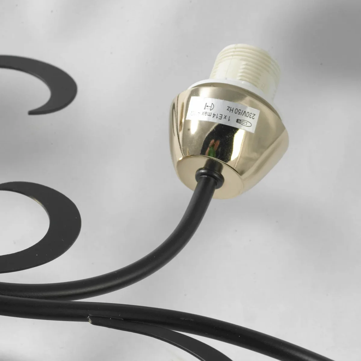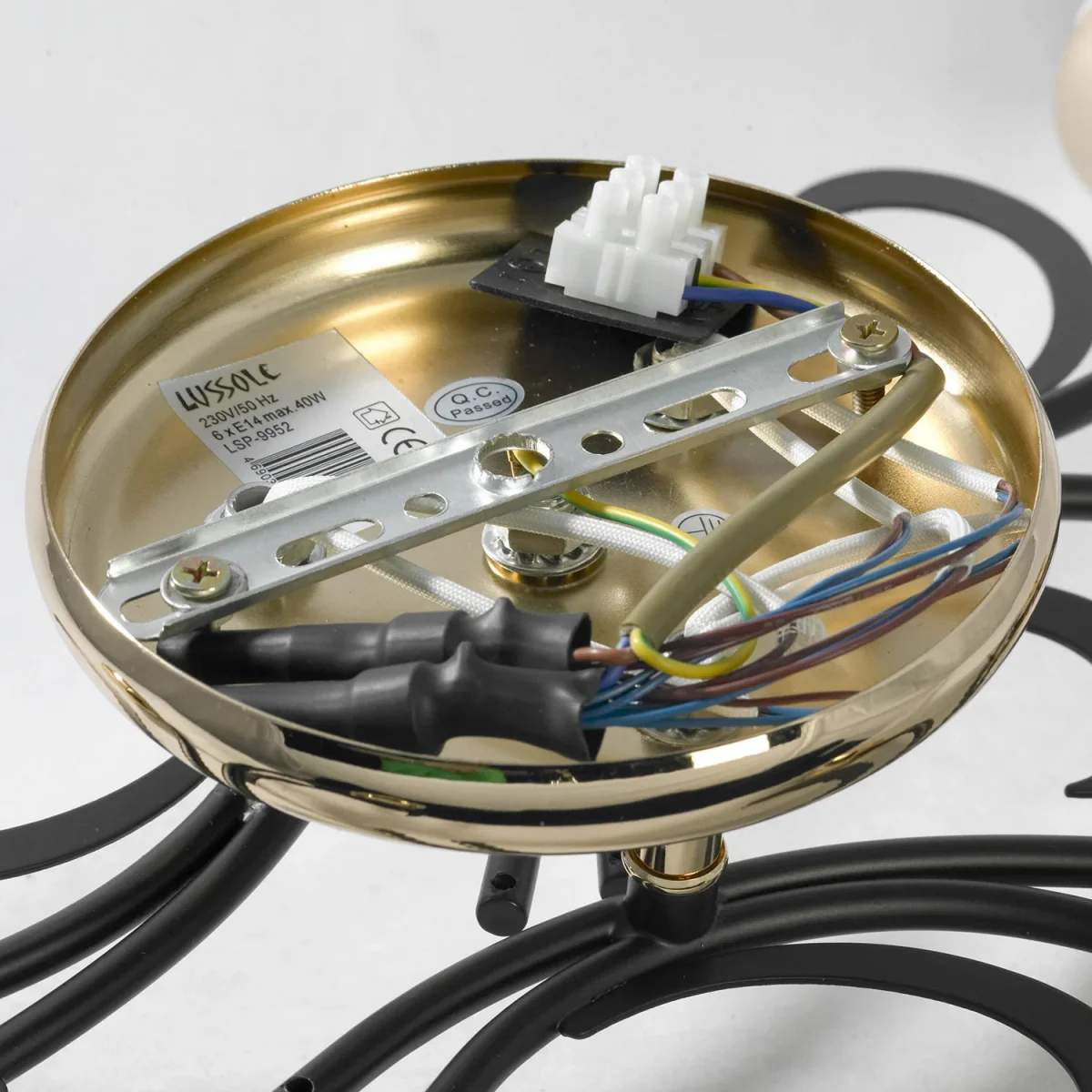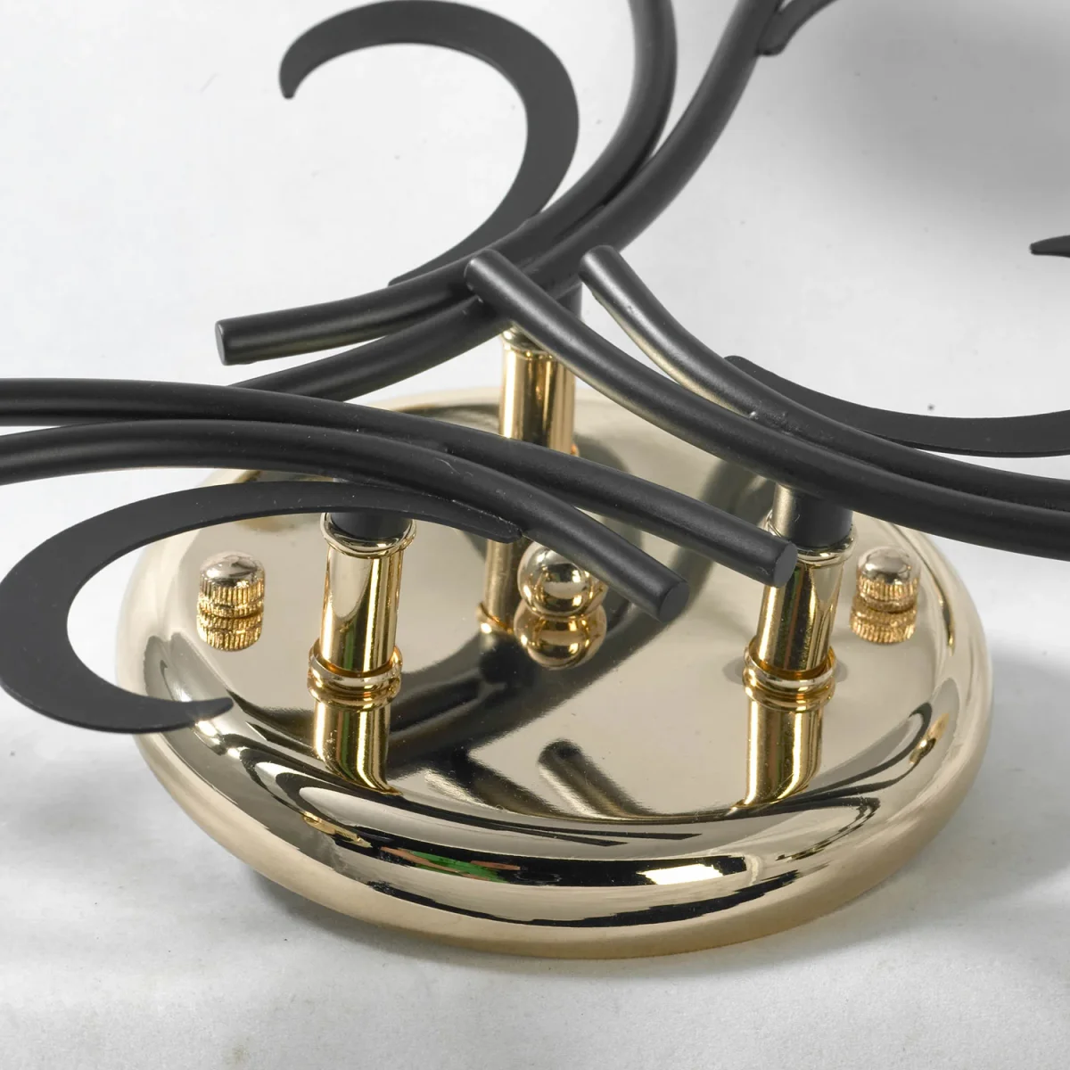 Невысокая потолочная люстра с шестью плафонами. Двухцветная арматура и двухцветные плафоны придают особую красоту изделию. Касаемо арматуры два цвета это золотой и черный. Золотой применен на потолочной чаше и в основании плафона. Плафоны используют соединение прозрачного и матового стекла, что позволяет снизить потери света на матовом стекле.