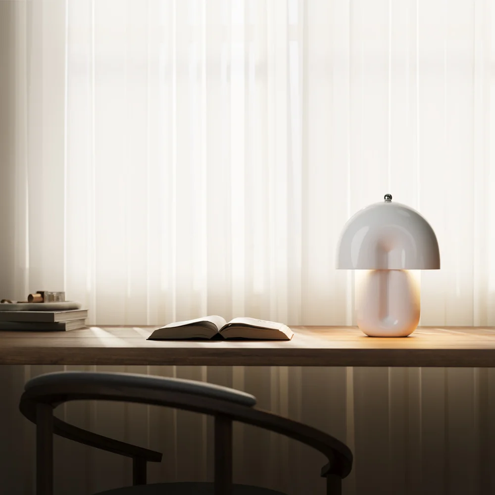 В основе дизайна — силуэт в форме «грибочка». Корпус светильника выполнен из натуральной керамики в трех цветах: шагреневый белый, глянцевые молочно-белый и нежный кашемир. LED-источник (3000К) с высокой световой отдачей (1400 лм) скрыт матовым акриловым рассеивателем и создает мягкий ореол под светильником. Сенсорный металлический шарик позволяет не только включать свет, но и регулировать его яркость. В комплекте предлагается два шара — в цвете сатинированной латуни или глянцевой платины.