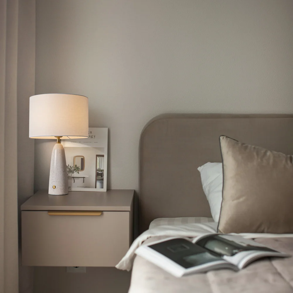 Белый тканевый абажур, мраморное основание в 4 цветовых решениях. Лампа E27 (в комплекте). Сенсорное управление. Элегантный дизайн с рассеивателем для мягкого света. Стильный аксессуар, который подчеркнет вашу индивидуальность