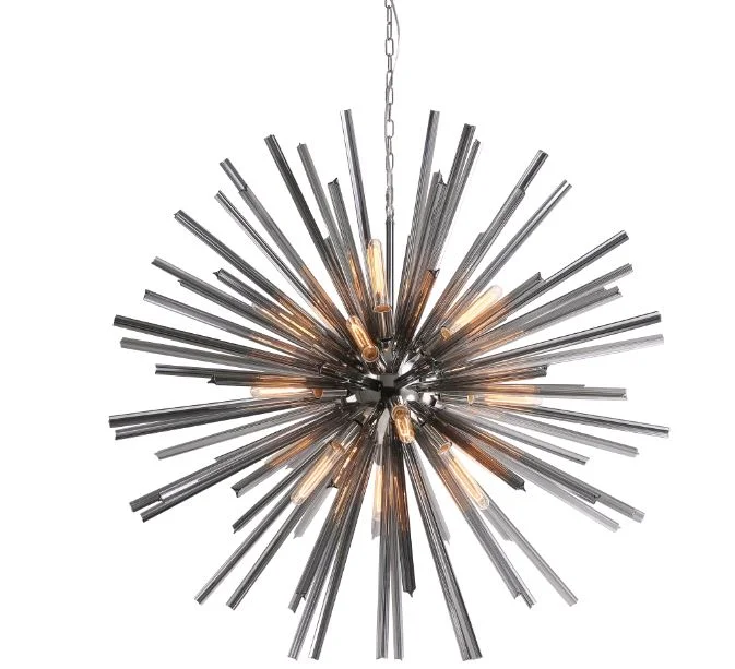 Дизайнерская люстра в хроме станет ярким акцентом в вашем интерьере. Тонкие палочки дымчатого цвета разбросаны в хаотичном порядке, а между ними размещены 12 лампочек. Люстра напоминает футуристичный светящийся шар. Композиция смотрится легко и дарит интерьеру динамику, не утяжеляя пространство.