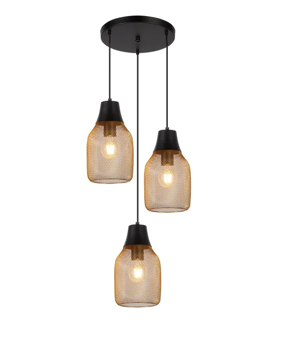 Лёгкий акцент в стиле лофт. Светильник коллекции Adalina сочетает в себе черную арматуру и золотистые металлические плафоны с сетчатой структурой. Его форма напоминает вытянутую каплю с плавными изгибами, создающими мягкий и уютный образ. Матовая поверхность добавляет строгости и стильности. Светильник подвешивается на шнуре, длина которого регулируется от 20 до 100 см. Это позволяет адаптировать его под разную высоту потолков и зонировать освещение — например, над обеденным столом или в зоне отдыха. Работает с тремя лампами E27 мощностью до 60 Вт каждая. Направление света — вниз, что делает модель идеальной для точечной подсветки. Крепится на планку, выключатель — на стене. Подходит для натяжных потолков. Отличный выбор для кухни, кафе, спальни, гостиной или загородного дома. Уместен как в современном интерьере, так и в лофт-пространствах. Создаёт тёплую атмосферу и добавляет характер любому помещению.