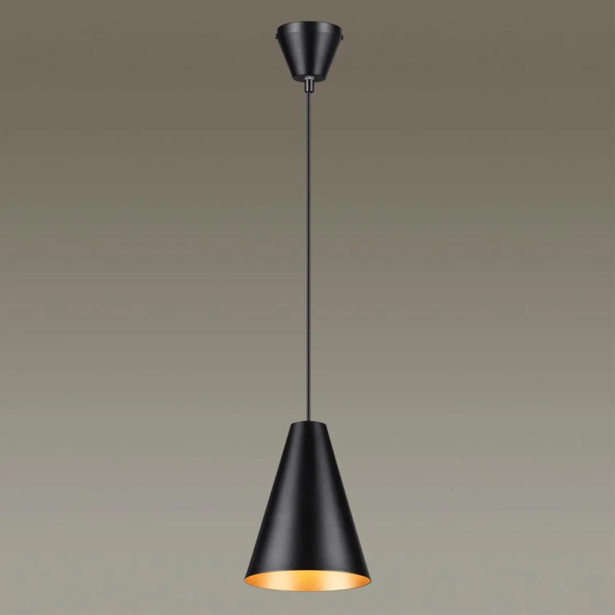 Линия металлических подвесов Brooks - отличное решения для студии в стиле лофт или общественного пространства. Черный металлический плафон внутри окрашен в золотой цвет, что придает рассеиваемому свету приятный теплый оттенок.