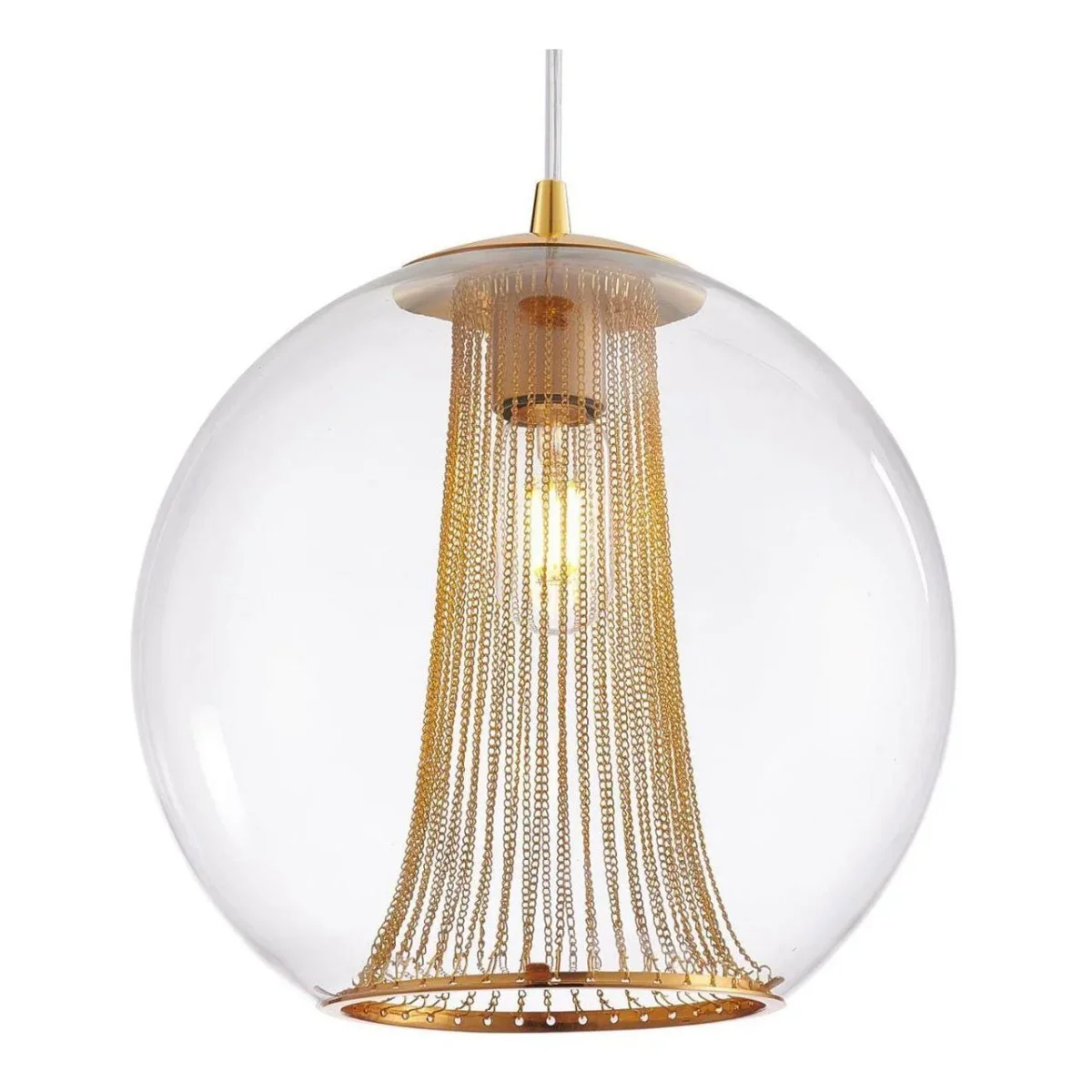 Описание товаракаркас золотого цвета, плафон из прозрачного стекла, декоративные цепочки в цвет каркаса