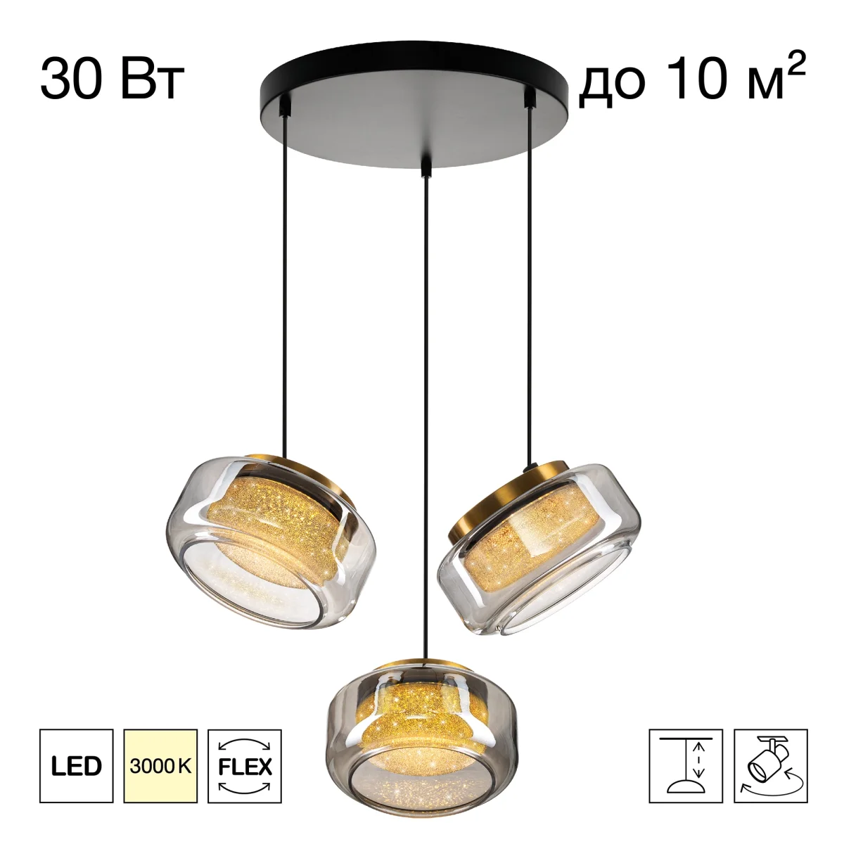 Citilux SIGNATURE CL247012 в стиле модерн станет изящным решением для светодизайна вашей спальни, гостиной или кухни. Основание изделия из металлического сплава черного оттенка. Плафоны с металлическим основанием бронзового оттенка, двойной конфигурации: внутренний плафон — из прозрачного стекла с хрустальной крошкой, внешний — из дымчатого стекла. Источником света служат встроенные светодиоды с цветовой температурой 3000К, мощность светильника составляет 30Вт. Мягкое освещение без мерцания и пульсаций не вредит зрению и не утомляет глаза. Светильник можно установить на любой потолок, в том числе, на натяжные и навесные конструкции. Тип крепления к потолку — планка. Особенностью модели является то, что можно менять не только высоту подвеса, но и угол наклона плафонов — перемещая элемент крепления вдоль основания плафона, можно изменить центр тяжести и, тем самым, внешний вид светильника. Причем, каждый из трех плафонов регулируется независимо от других, что открывает шикарные возможности для создания самых разных силуэтов.