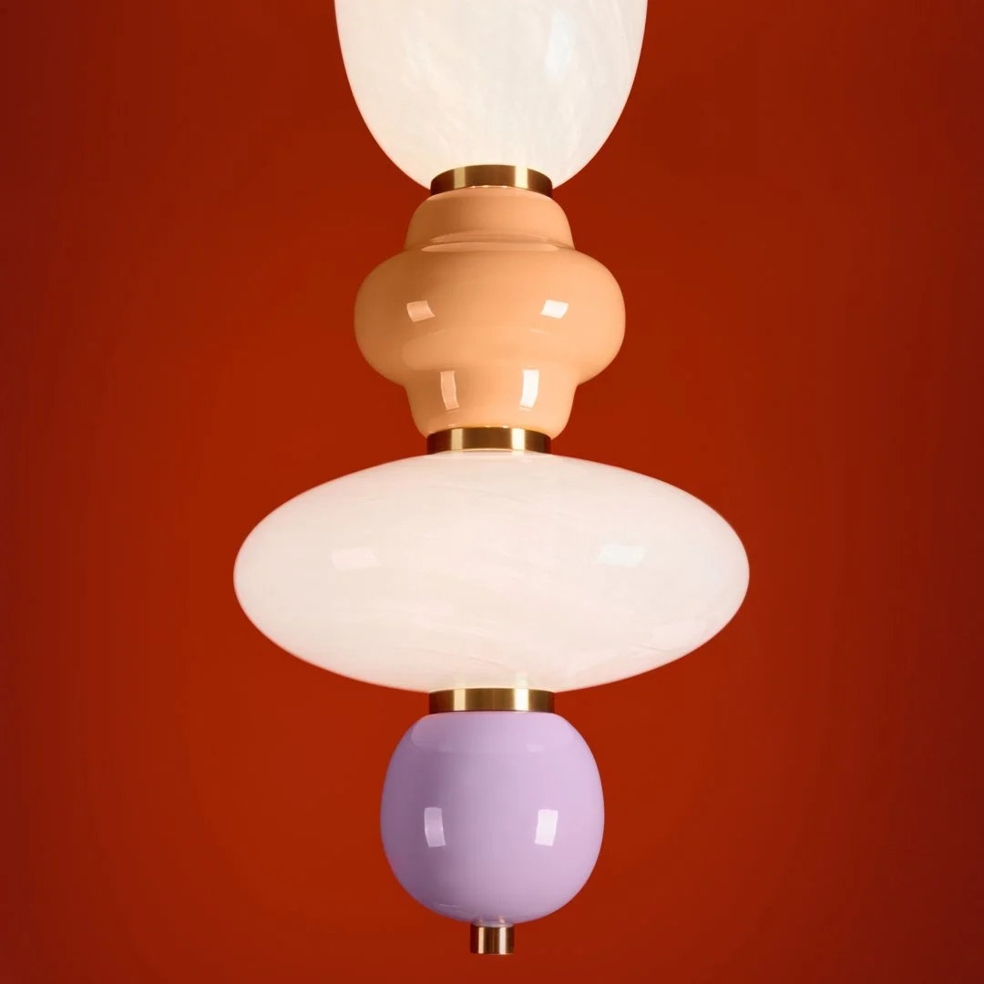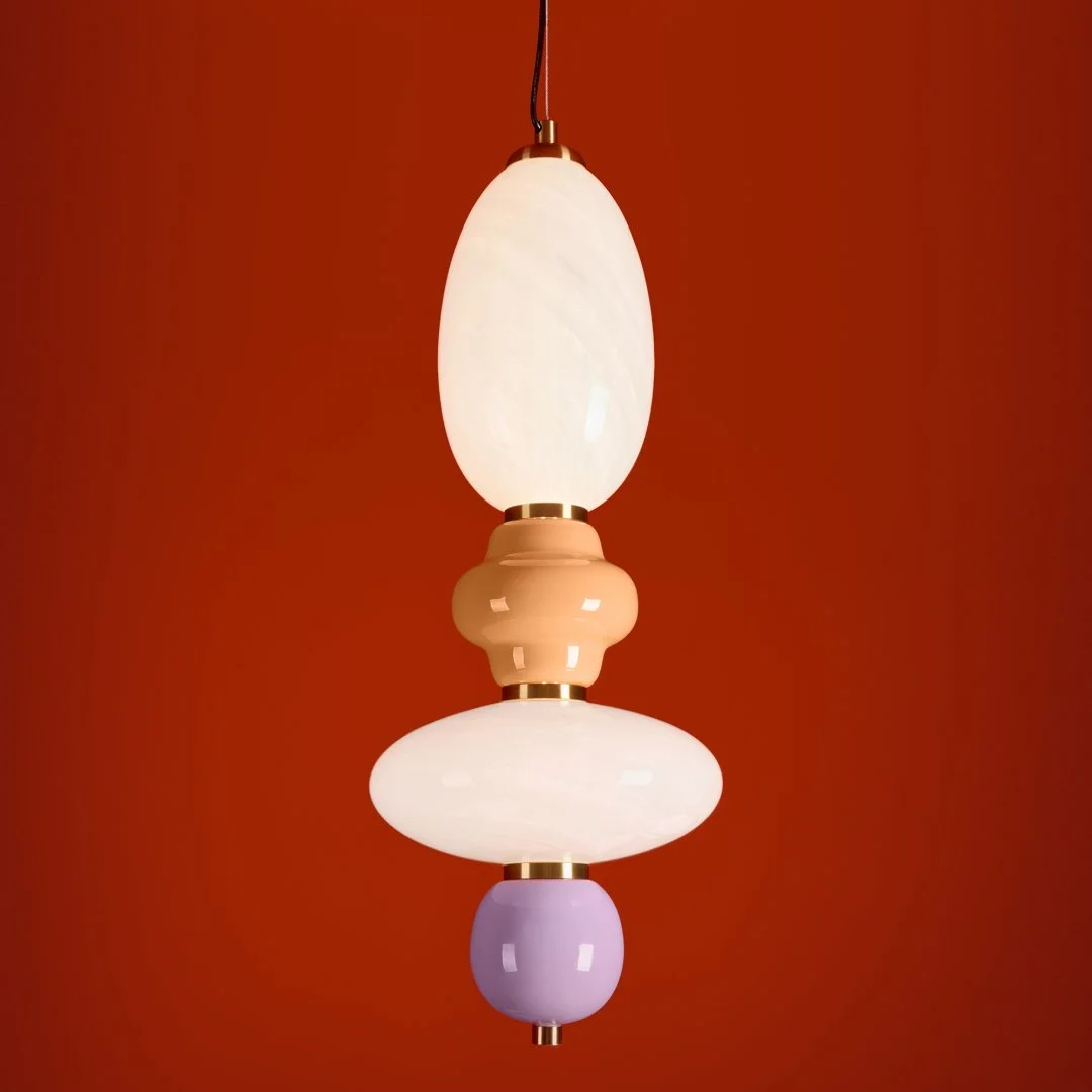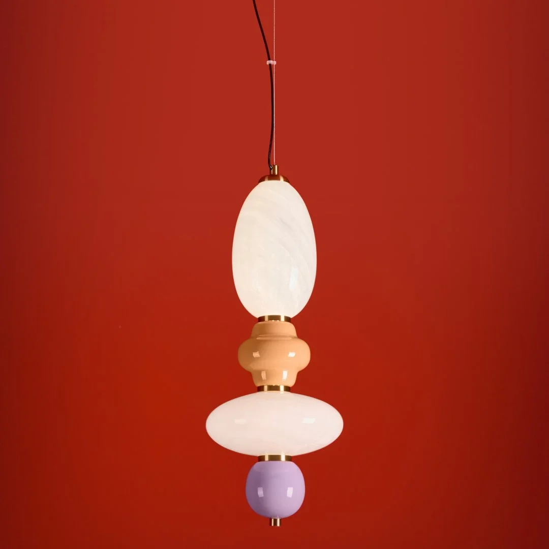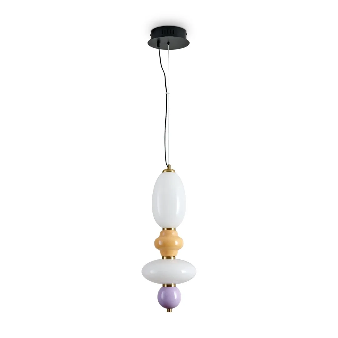 Металлическая арматура черного цвета. Глянцевые белые стеклянные плафоны с перламутровым рисунком и керамическими цветными элементами. LED источник света. Два вида подвеса.