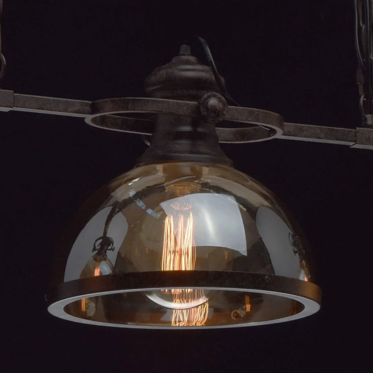 Светильник выполнен в ультрасовременном стиле лофт. Черный цвет светильника с эффектом ржавчины и массивный декор придают подвесу винтажный вид. Есть возможность регулировать высоту подвесов по отношению к потолку. Стеклянный плафон коричневого оттенка привлекает внимание и создает мягкое направленное освещение. Светильник можно размещать как в жилых помещениях, так и в помещениях клубов, кафе и ресторанов. 2 варианта по количеству лампочек дает возможность комплексного освещения помещения а так же возможность создавать индивидуальные композиции из единичных подвесов.